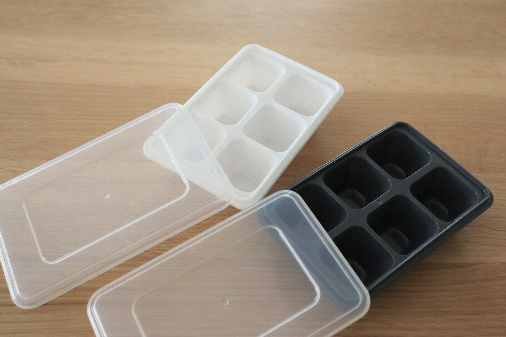 ノーマルタイプの製氷皿の半分ほどの大きさで、6個の氷がつくれる容器が2つセットになって110円です。白とグレーの2色セットで、オシャレにも抜かりがありません。