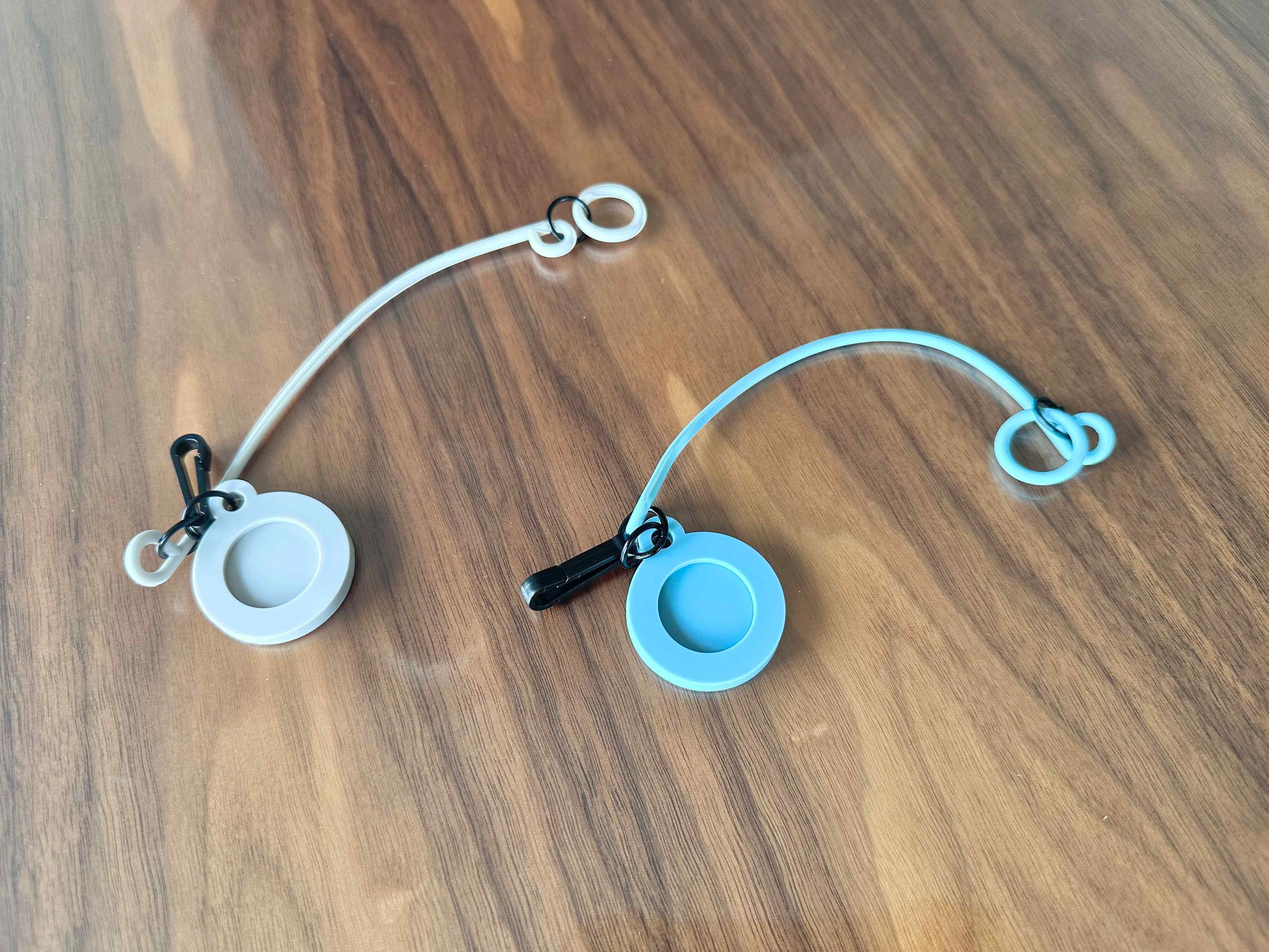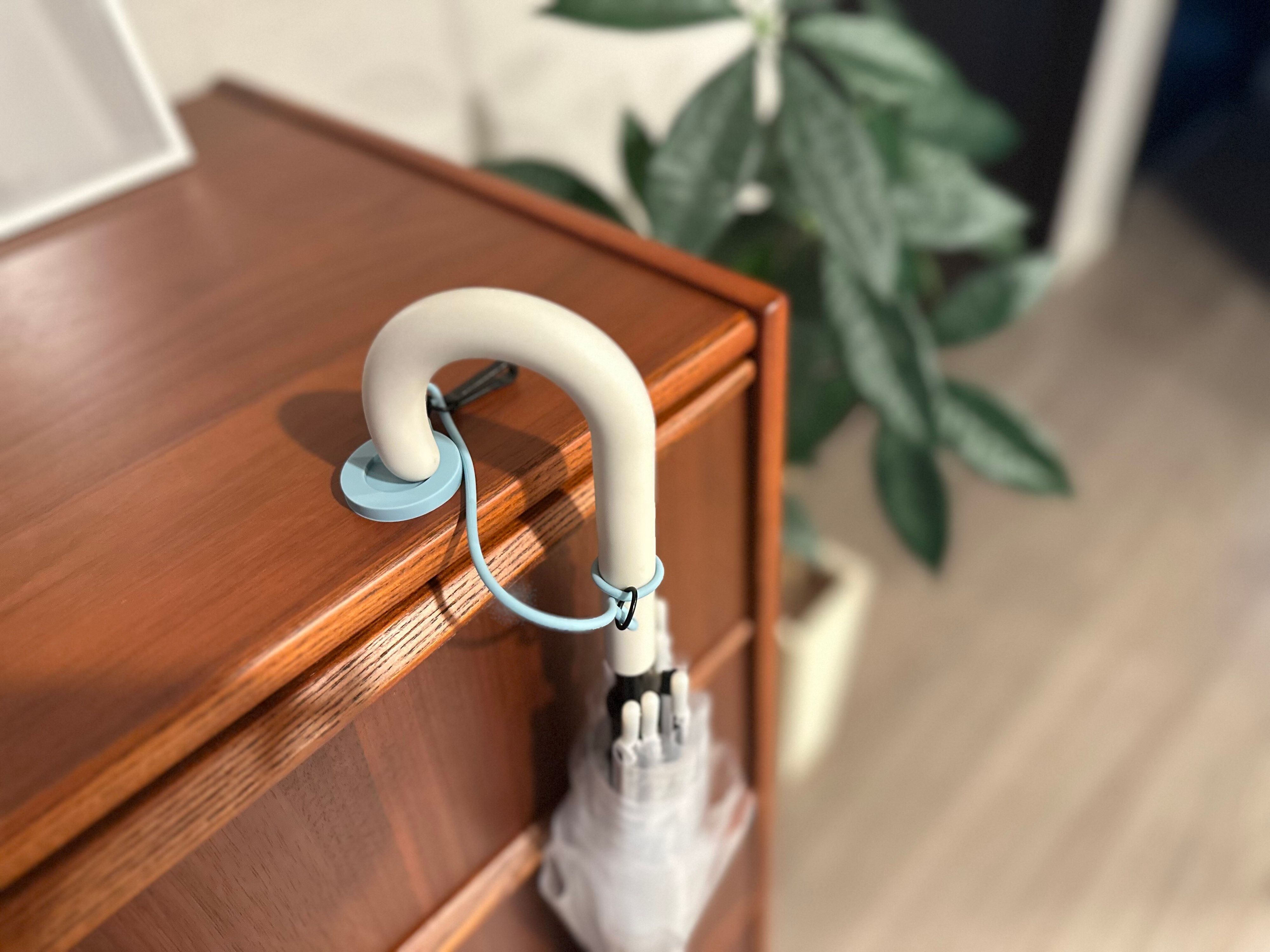 ビニール傘の持ち手に輪っかを通して装着しておくと、目印になってくれますよ。長めのシリコーン紐はクリップで留められるようになっていて、邪魔にならないようになっています。
