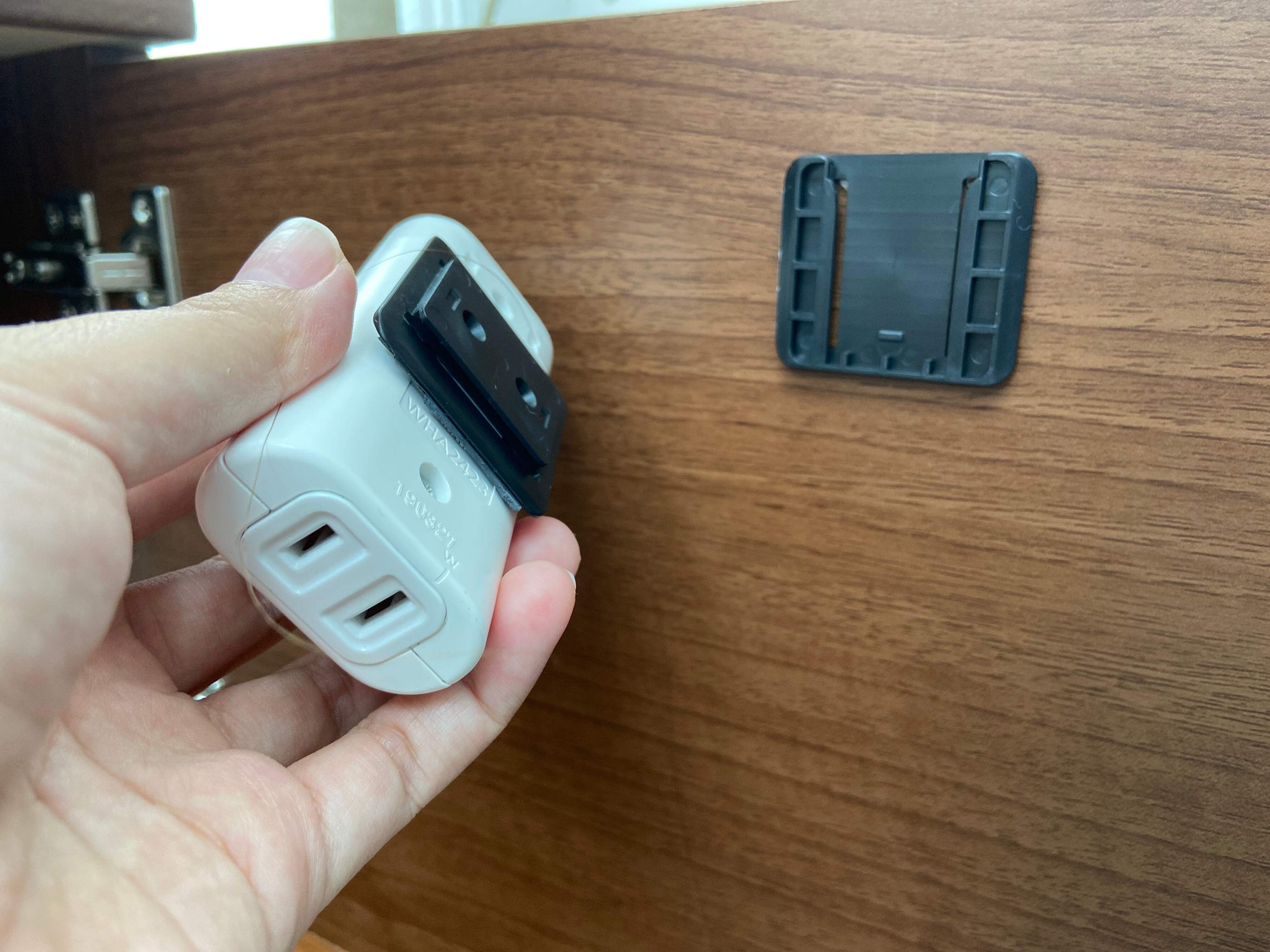 電源タップとタップを固定したい場所それぞれに付属のテープで「電源タップ固定器」を張り付けて、スライドさせて取り外すこともできるようになっているので、もし他の場所で電源タップを使いたい時も安心です。