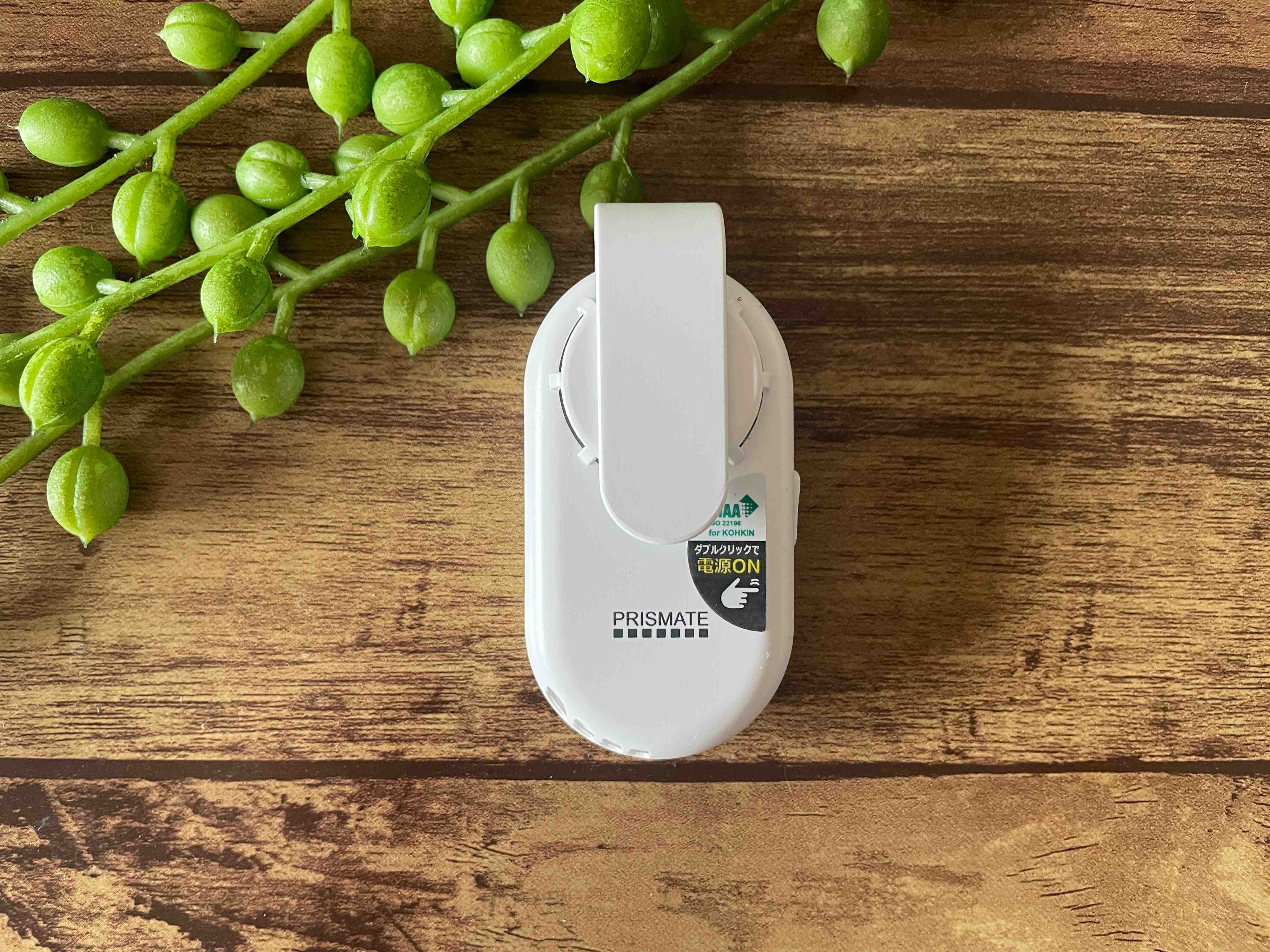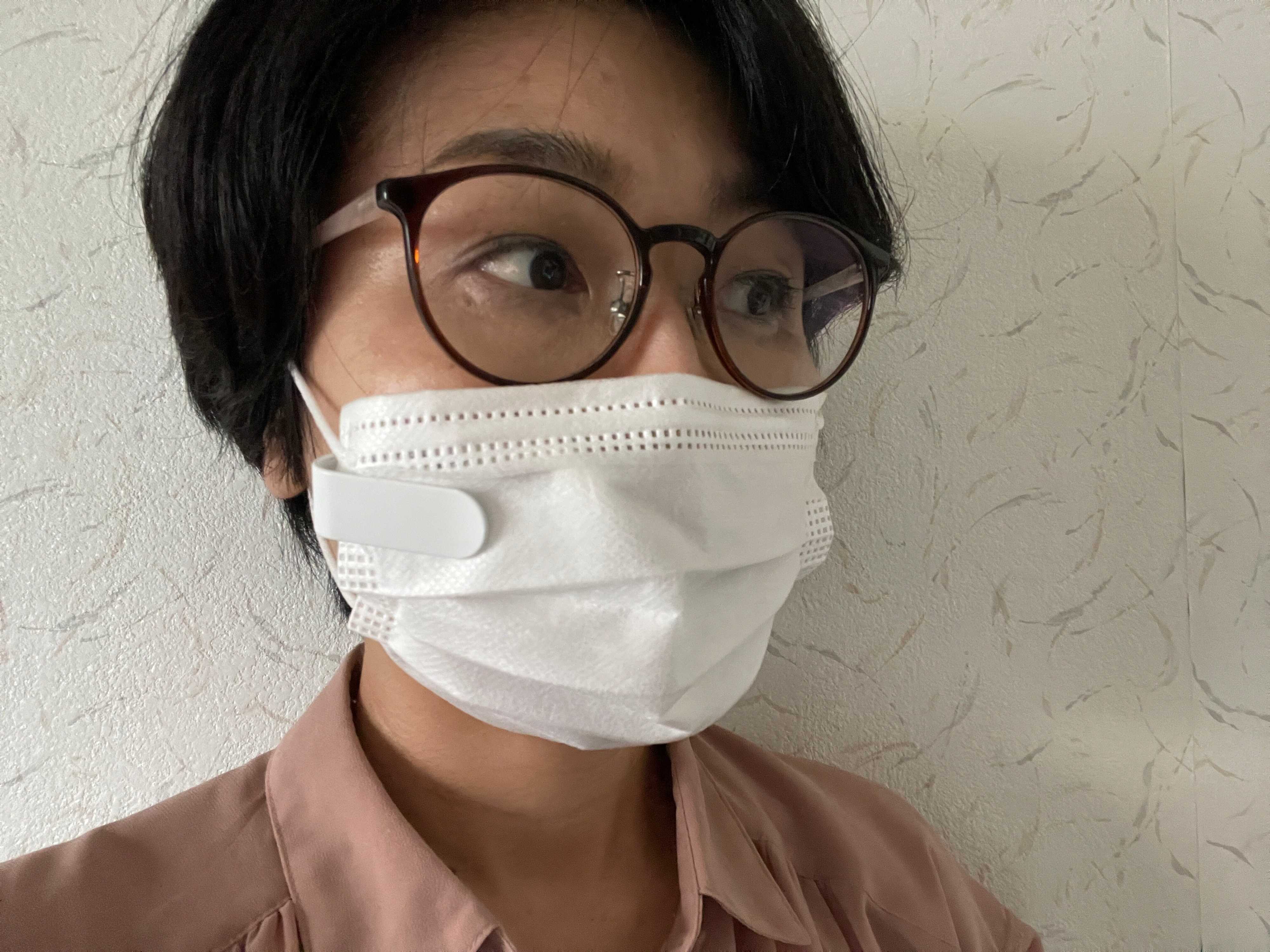 実際にマスクへ装着してみました。クリップ部分を外側にして、ファンをマスクの内側に付けます。白いマスクなら、クリップはあまり目立ちませんね。