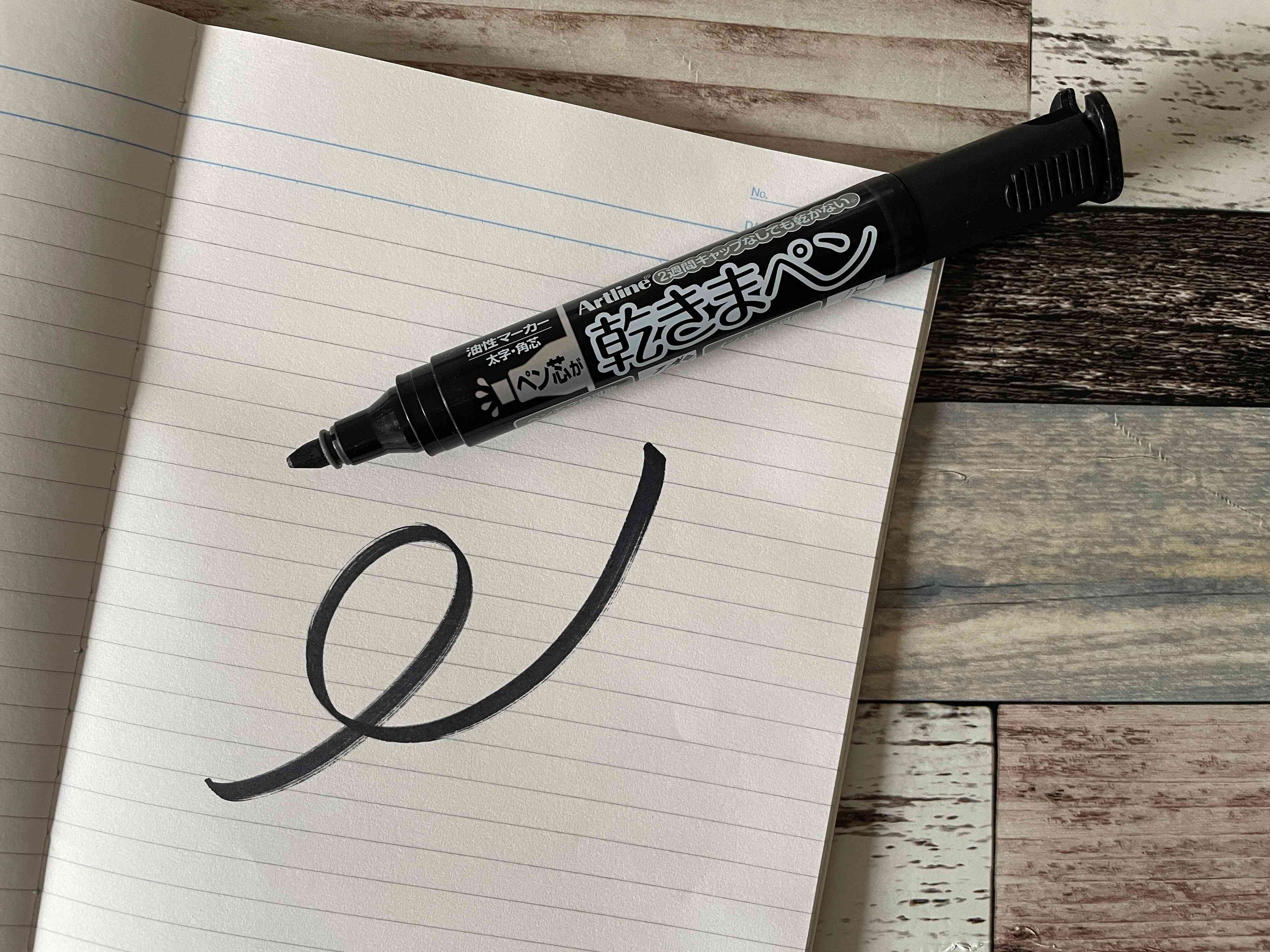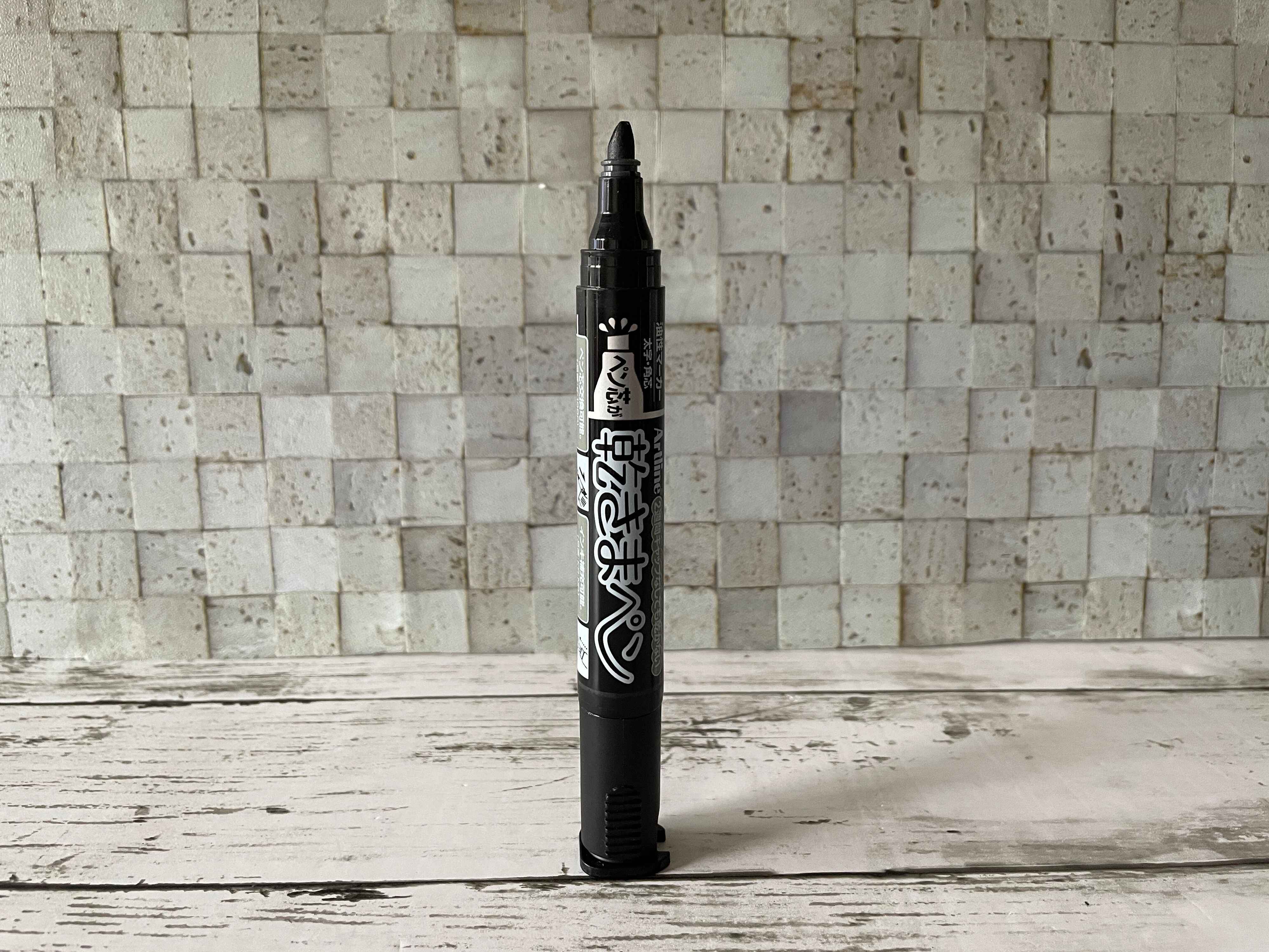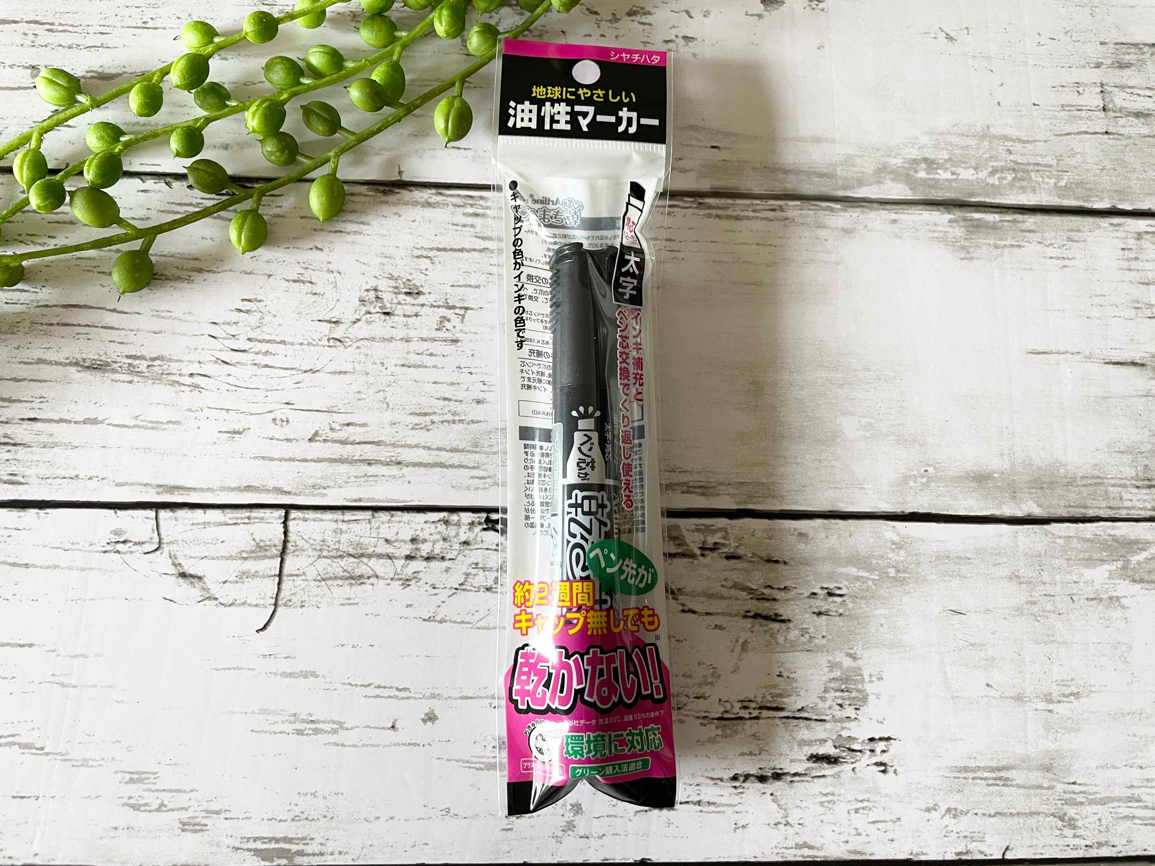 このペンのすごいところは、その名のとおりキャップなしでも2週間ペン先が乾かないというところ。そしてこのペン、正式な販売名は「シヤチハタ ペン先乾かない油性マーカー太字黒」という名前。