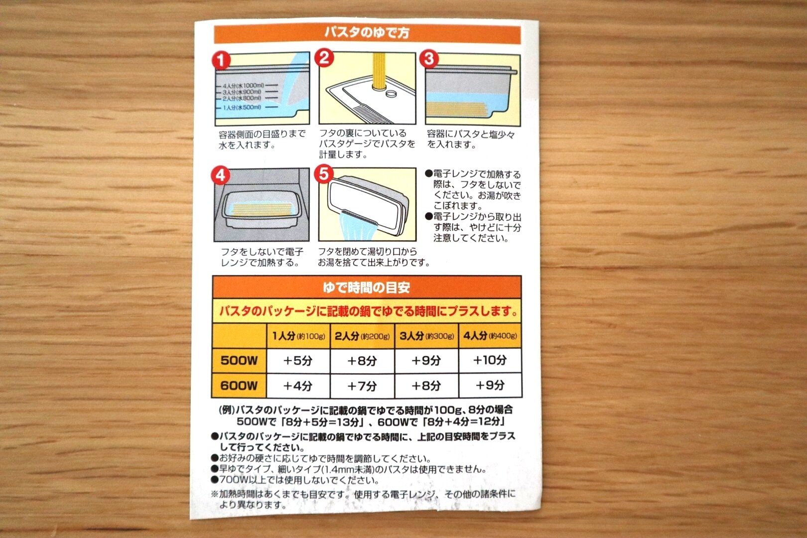 本体にもゆで時間や調理方法は書かれていますが、本体と同色で書かれているため読みにくいです。パッケージを切り取って保存しておくのがベター。