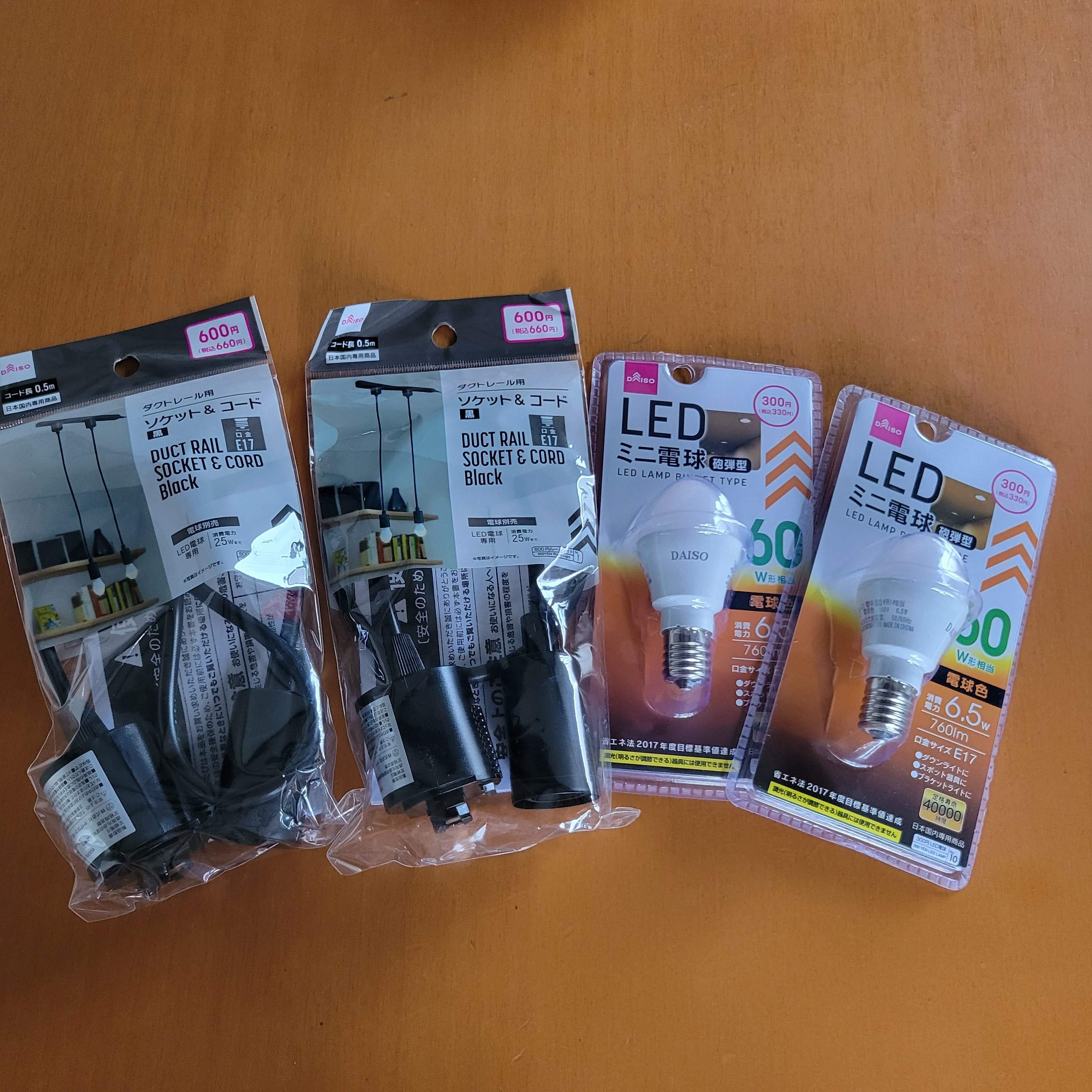 ソケット&コードは白色もありましたし、電球も口金サイズがE26のものもありました。その他にもスポットライトなども数多く販売されていて、今や照明器具もダイソーで買える時代となっていることに驚きました!