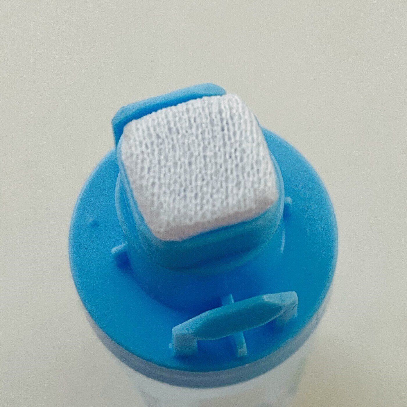 フタを押して開けると出てくるのが、のりが染み出すスポンジ部分。通常の液体のりはスポンジ部分が円形ですが、こちらは何と”四角”!これはありそうでなかった斬新な形だなと感心してしまいました。
