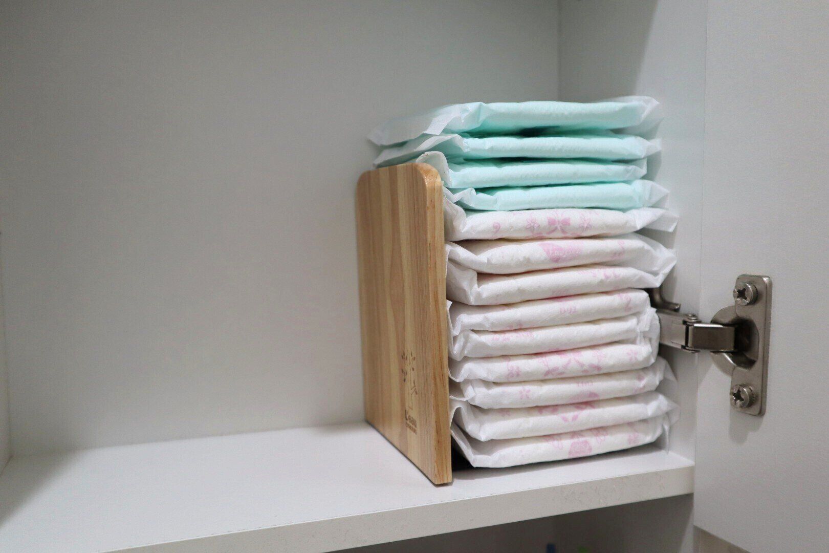 手軽で使いやすく、サニタリー用品の数によって幅を自由に変えられるのがメリット。木目調のブックエンドはオシャレな雰囲気も演出できます。