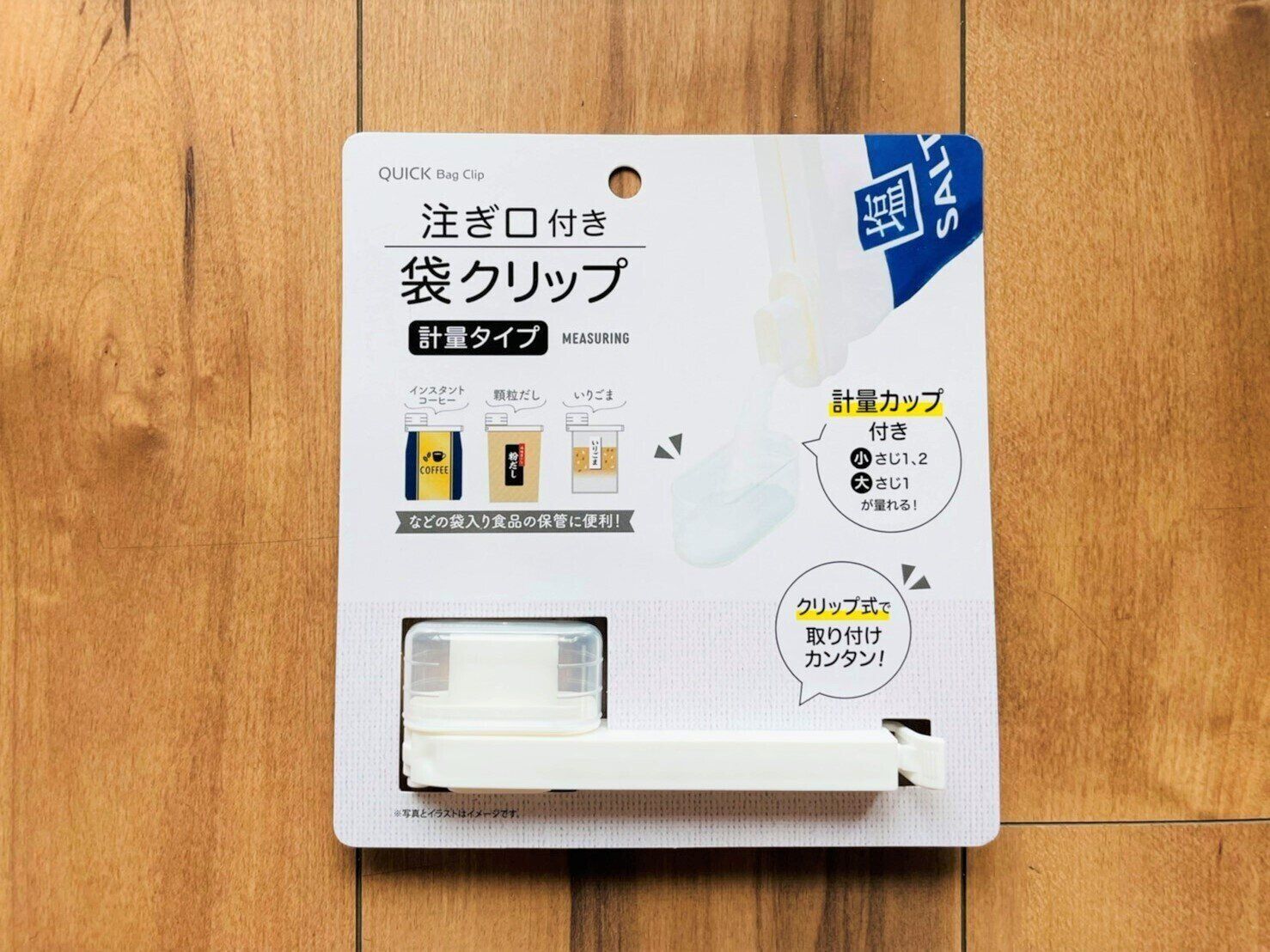 見つけた瞬間に購入したセリアの「注ぎ口付き袋クリップ」(税込110円)は2種類あります。1つが計量タイプ。インスタントコーヒーや顆粒だし、いりごまなどの袋入り商品の保管に便利なタイプです。