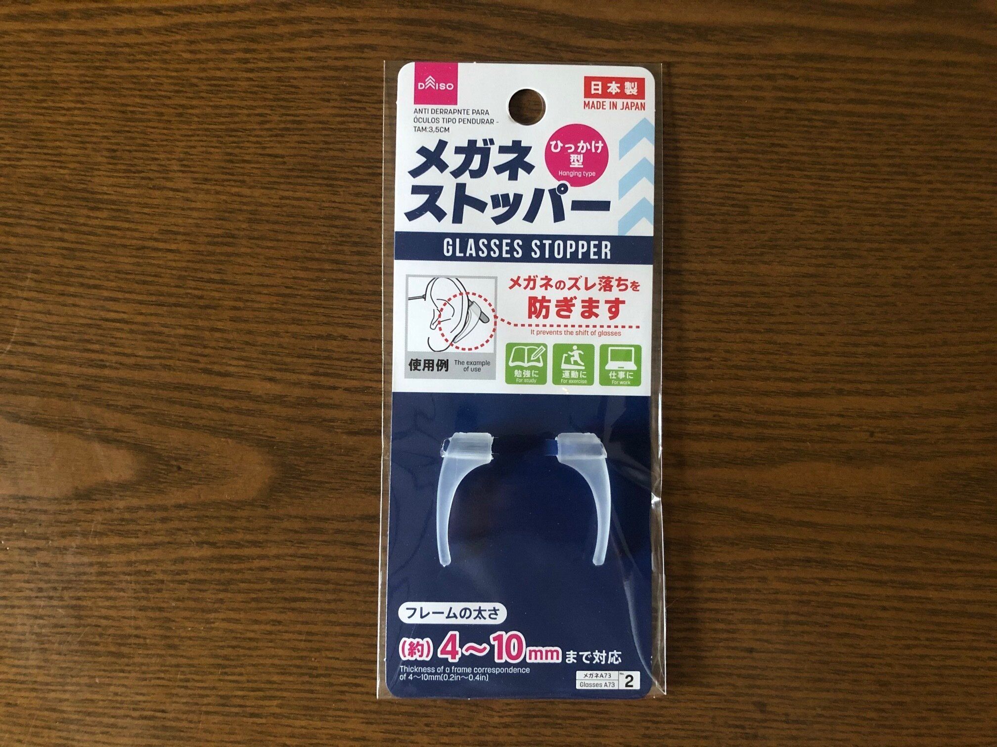 メガネのイライラ解消グッズ、それはダイソーの「メガネストッパーひっかけ型」です。価格は2個入りで110円。材質はシリコーンエラストマー。約4~10mmまでのフレーム太さに対応しています。