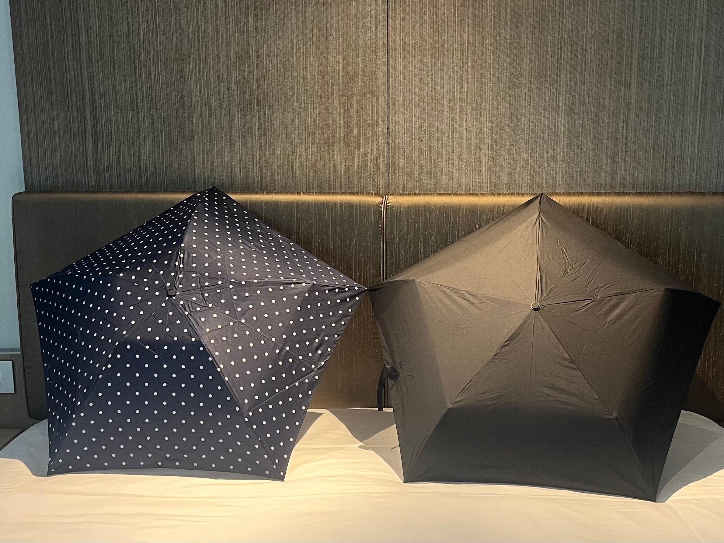 右の傘は2代目です。軽くて小さすぎて、海外旅行の時にタクシーに置き忘れました。3,000円以上するのに……。それでも、同じ傘を再購入するくらい重宝しているんです。