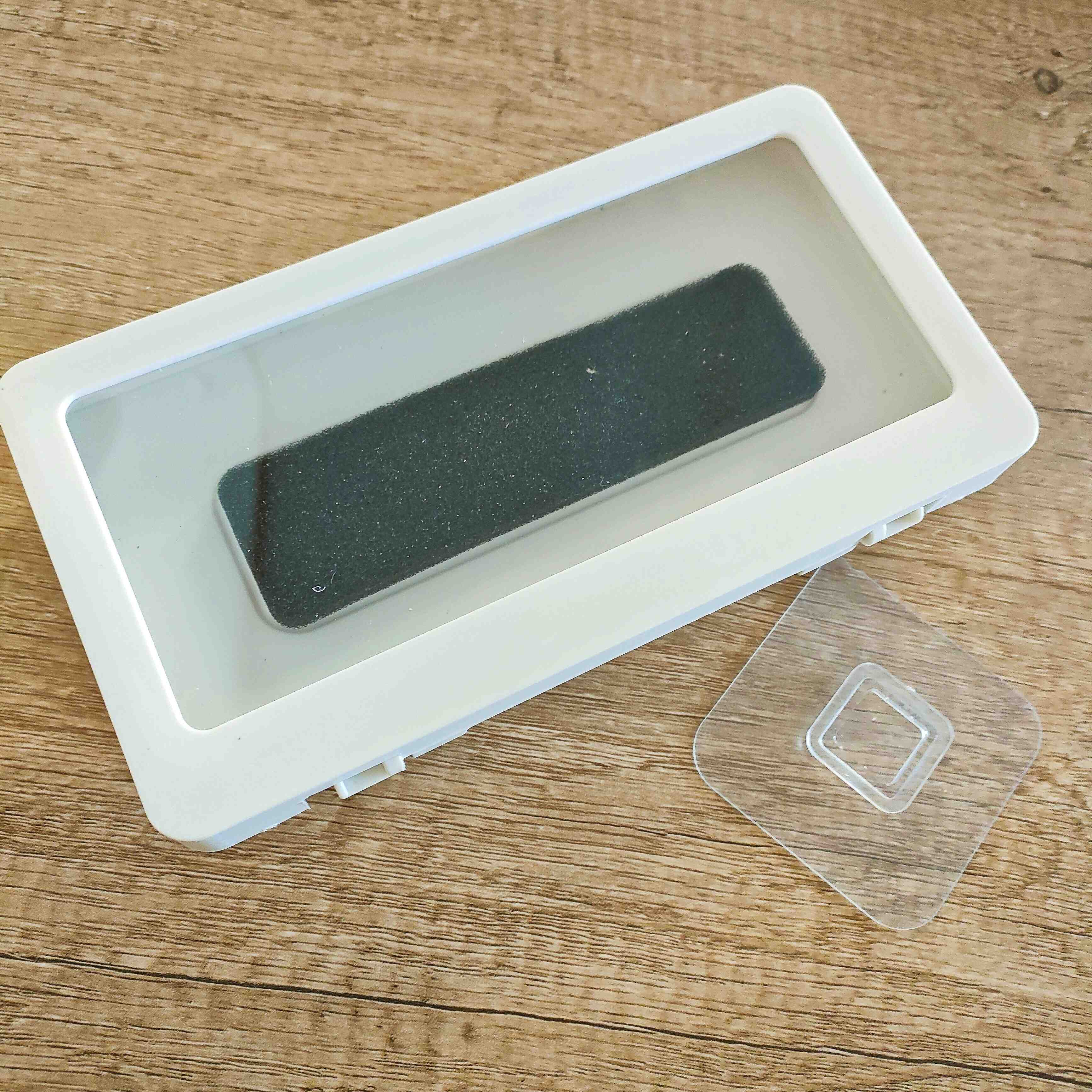 使い方はケータイをケースの中に入れるだけ。中にスポンジがあり、衝撃吸収と画面調節をしてくれます。
