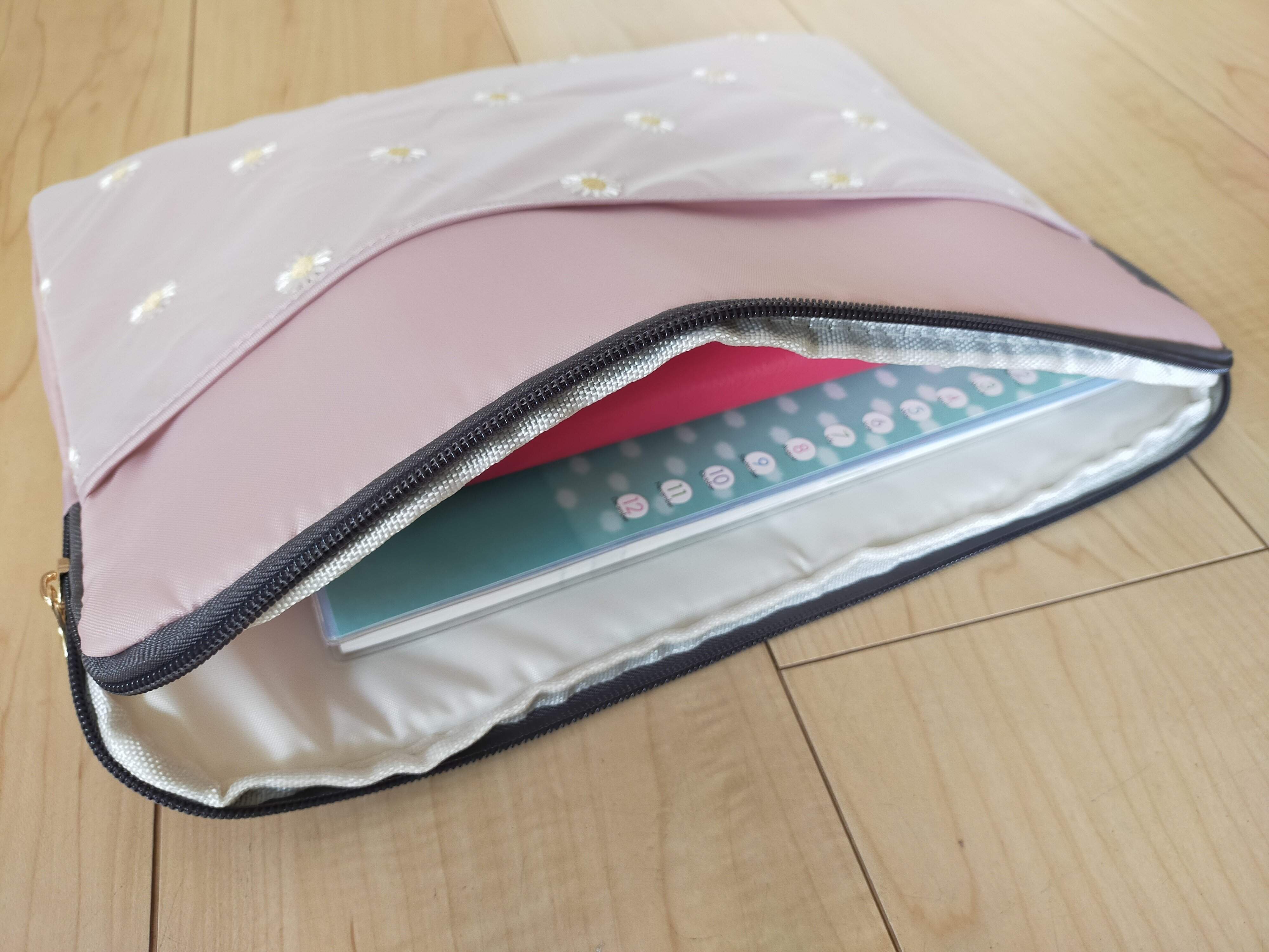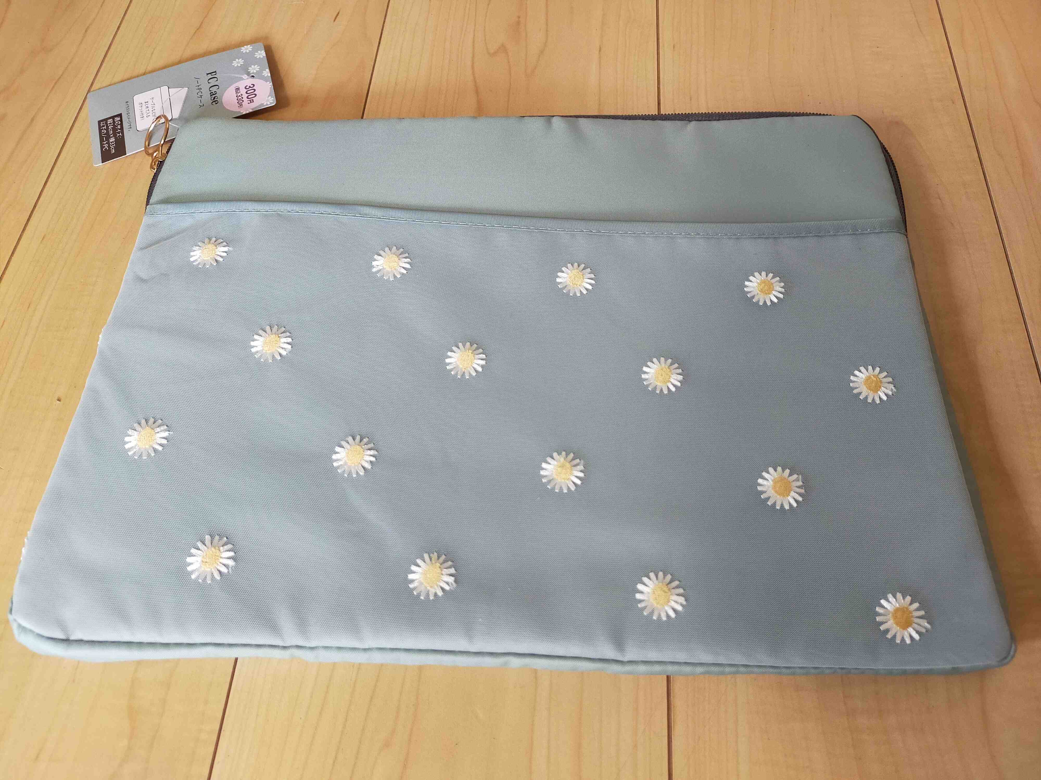 まずパッと明るいデザインに惹かれたこちらのPCケース。330円と侮るなかれ。生地はクッション性があり厚みもあります。