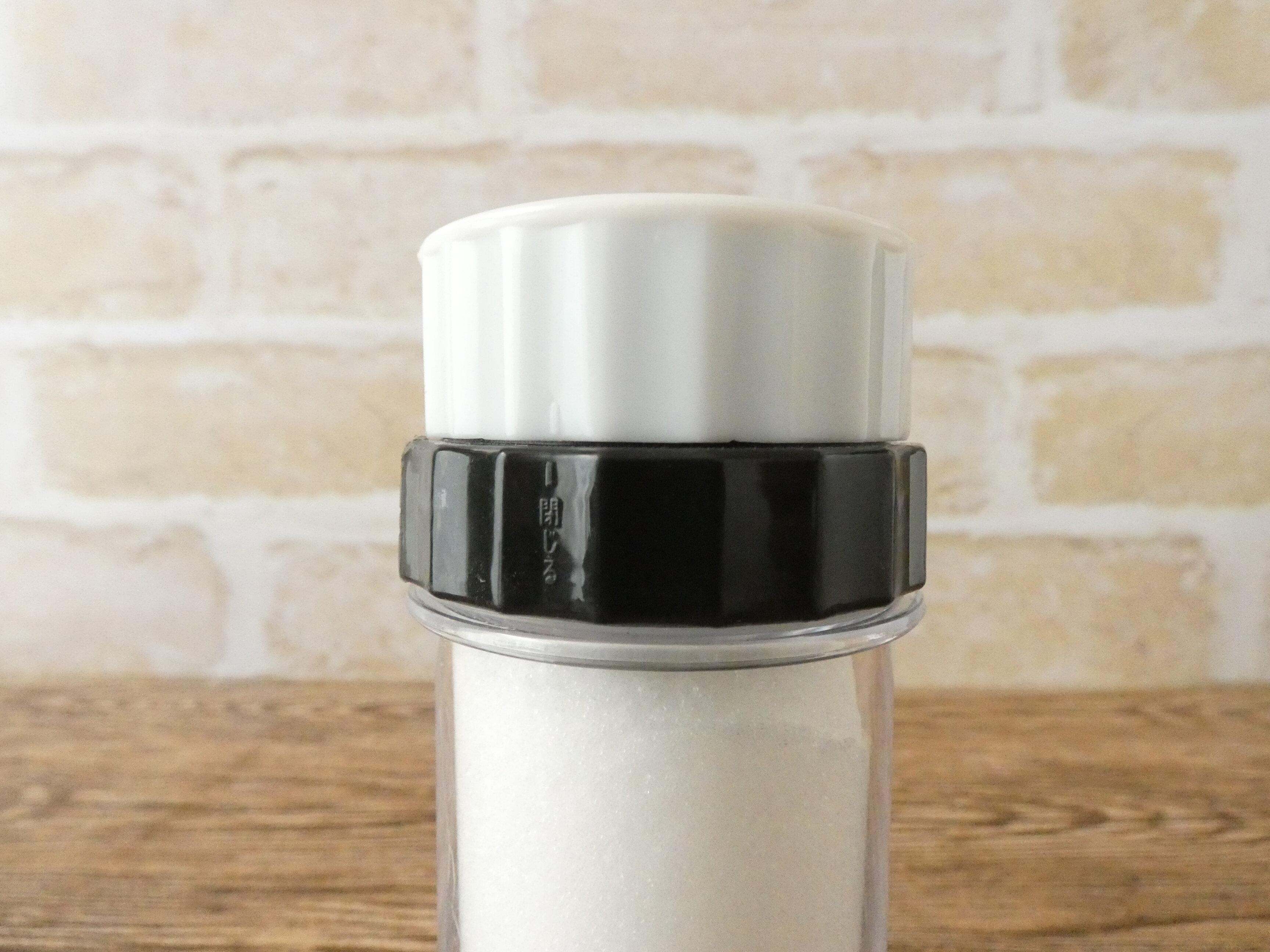 3カ所の取り出し口を使い分けしたいのは塩だったので、入れてみました。少量振り出したり、ダイレクトに出したいときは白い部分を回して穴に合わせればOKです。