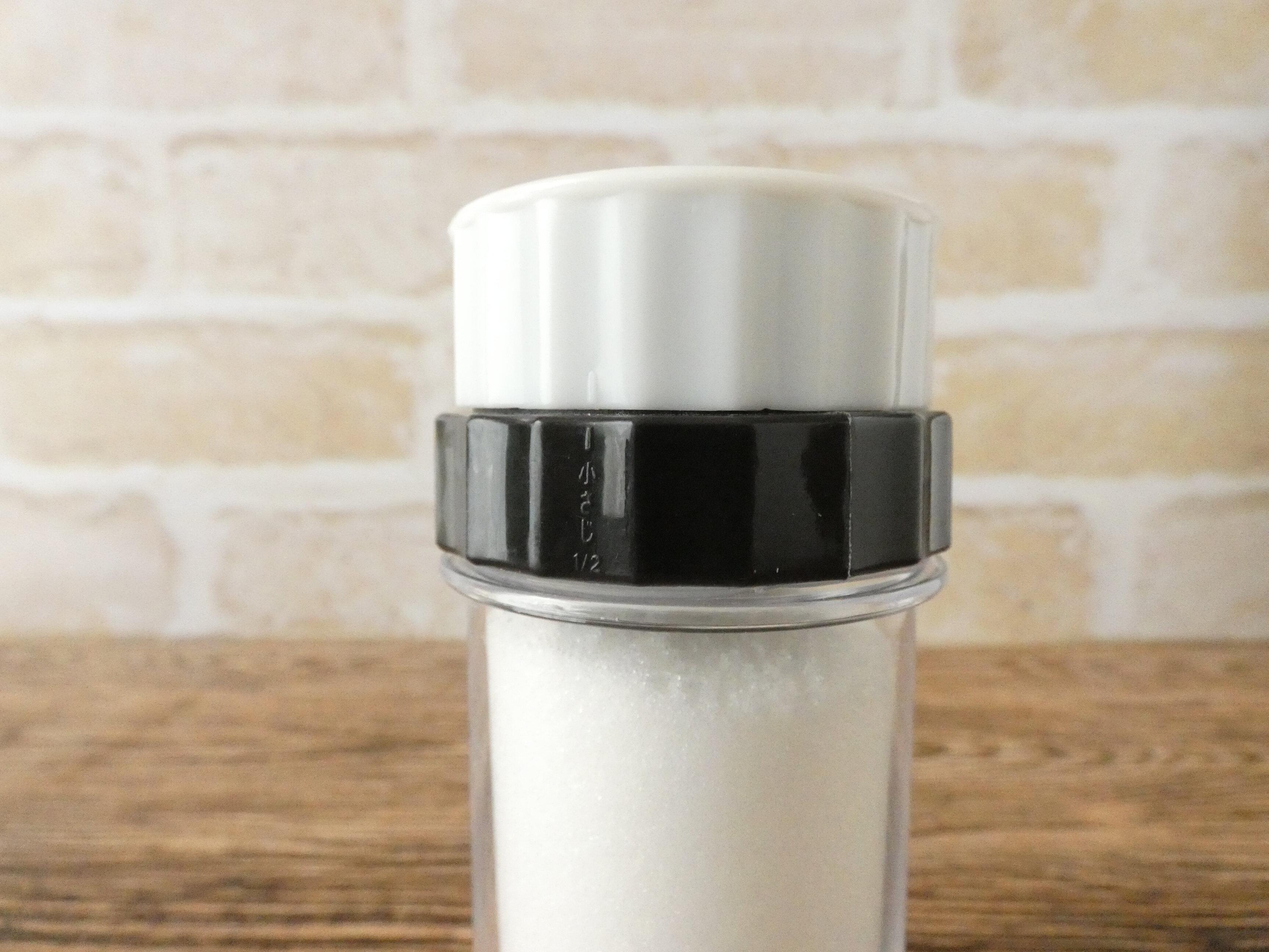 商品名の通り調味料を小さじ1/2計量できますが、それだけではないんです。白いキャップを開けると調味料が振り出す部分が3カ所あり、少量振り出したり、たっぷり使いたいときはダイレクトに出せます。