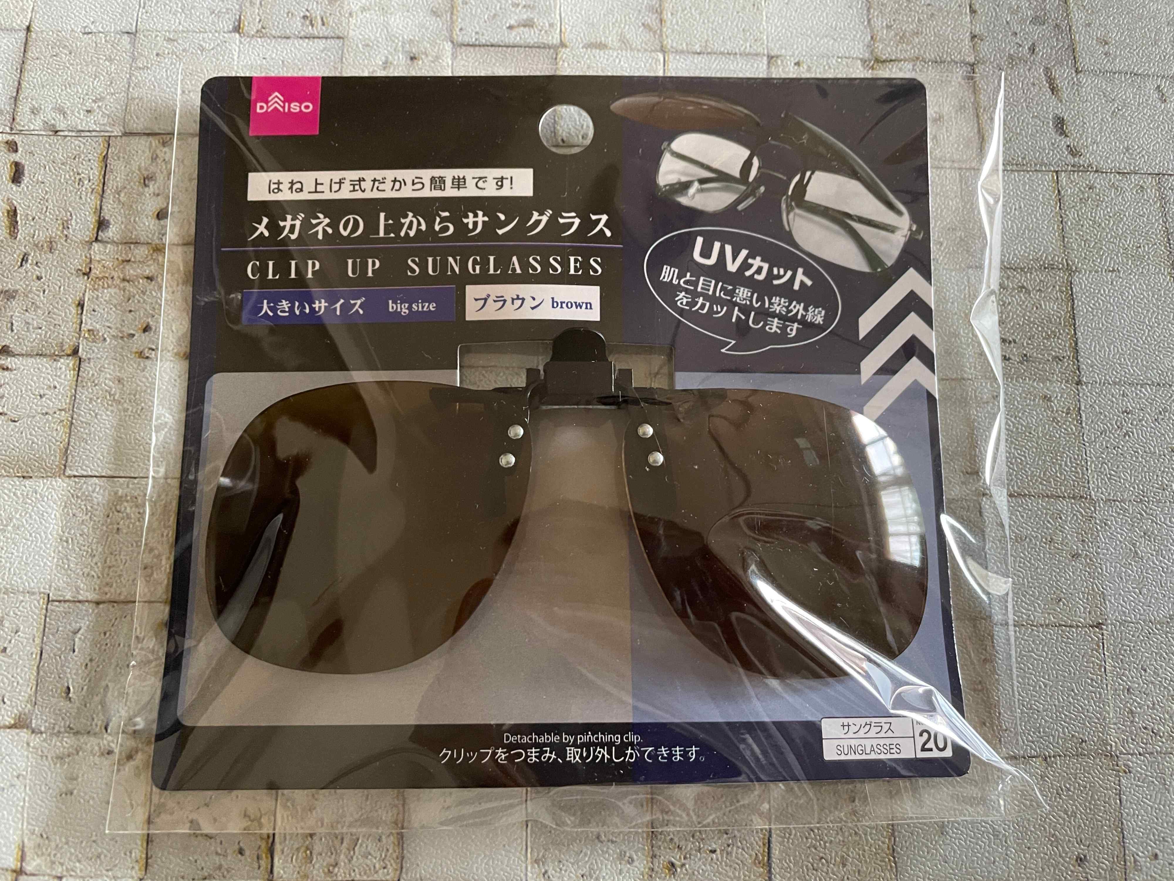 ご紹介するのは、ダイソーの「メガネの上からサングラス」です。その名の通り、メガネの上に付けられるサングラスなんですよ。
