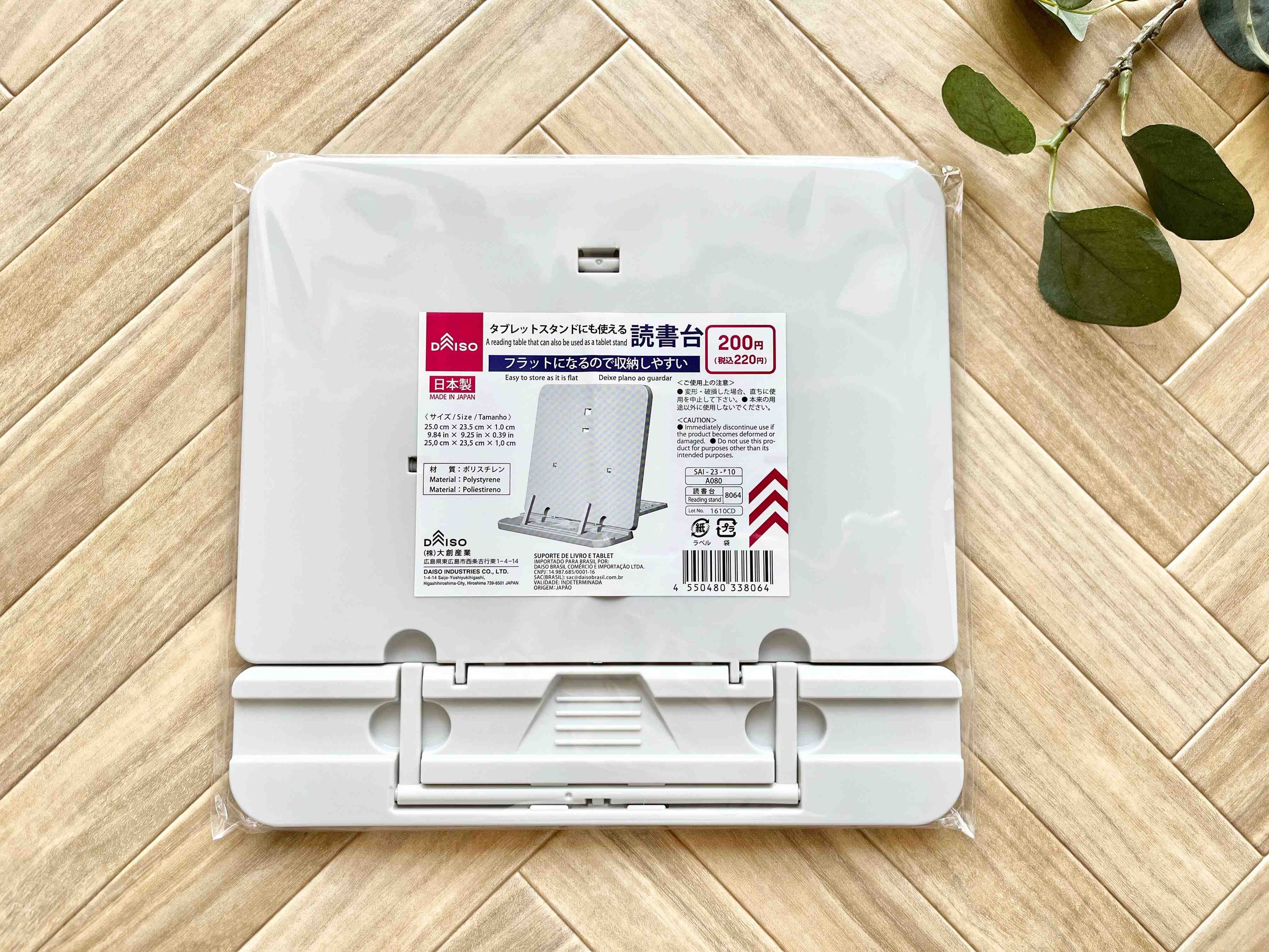 ご紹介するのは、ダイソーの「タブレットスタンドにも使える読書台」。販売価格は220円なのでダイソーの中では高額商品ですが、それでもお値段以上に役立つということで、とても人気のある商品なんですよ。
