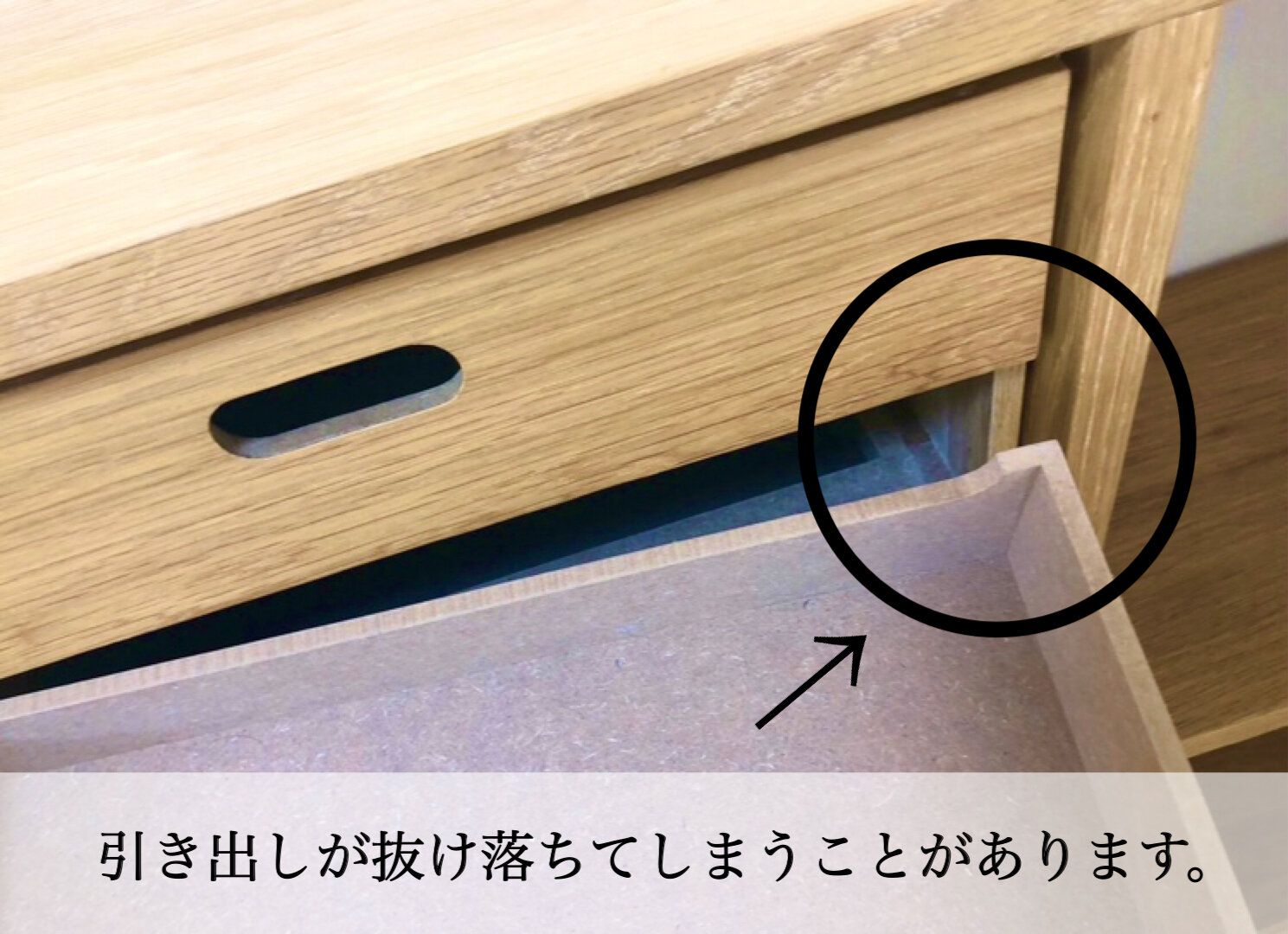 引き出しをそのまま引き抜いて持ち運べるという利点もあるんですが、我が家では子供が使う場合もあるので、スポっと抜け落ちて落下してしまったら大変!