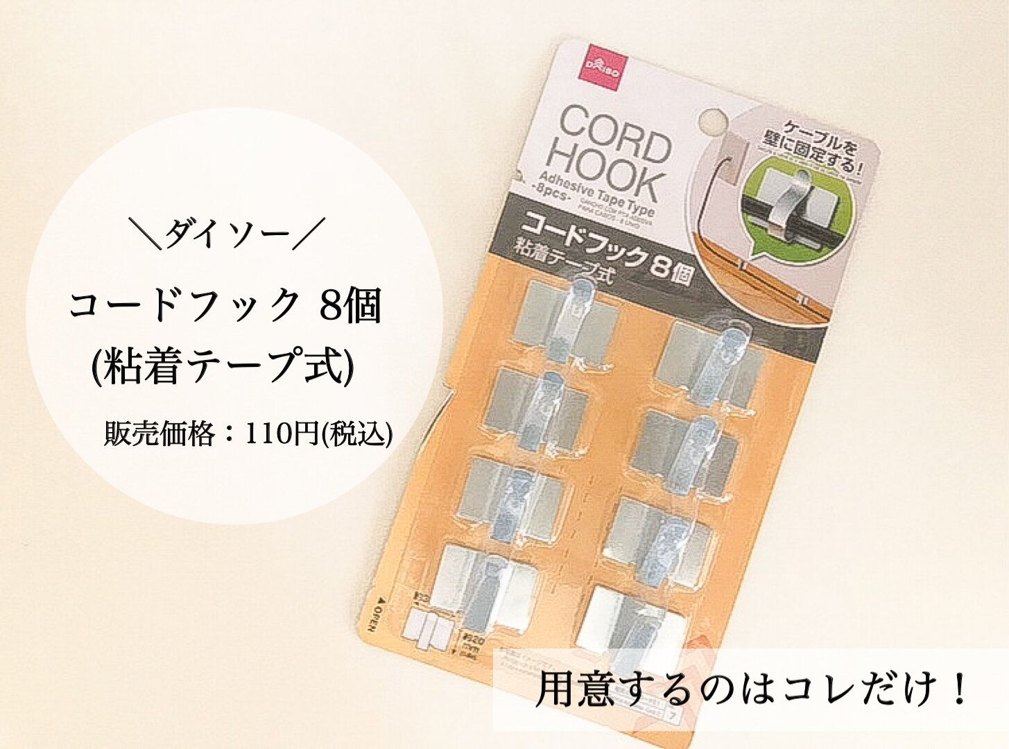 用意するものは、ダイソーの『コードフック8個(粘着テープ式)』たった一つだけ!