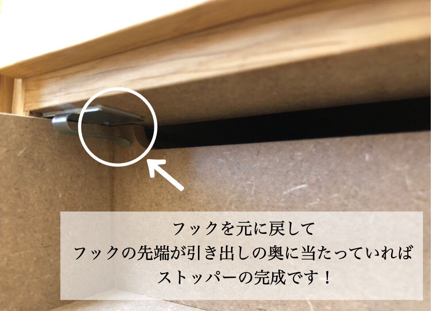 そしてフックの先端が引き出しの奥に当たることを確認出来たらストッパーの完成です。
