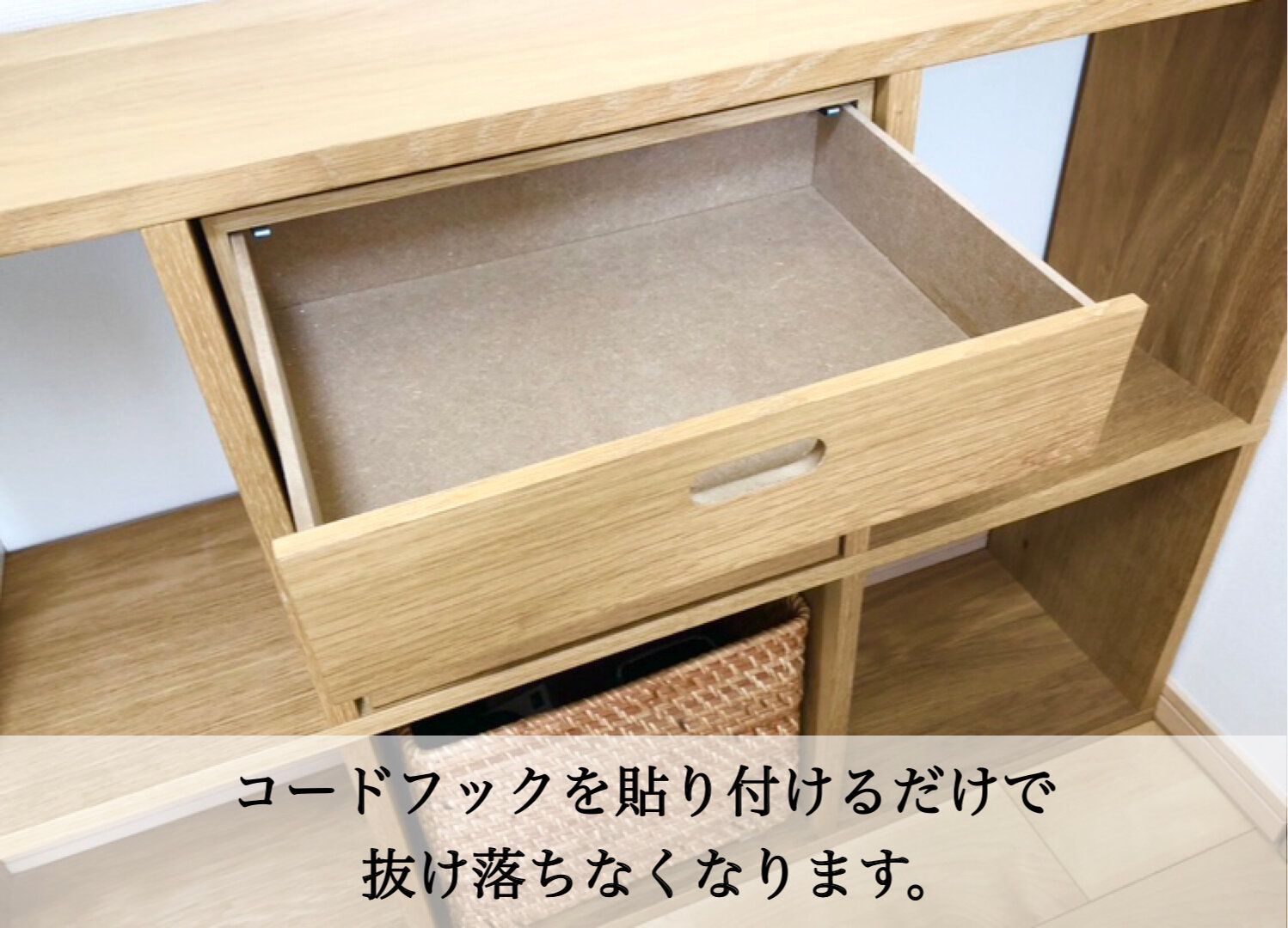 コードフックを貼ってしまうと、後から引き出しは差し込めなくなるのでご注意下さい。