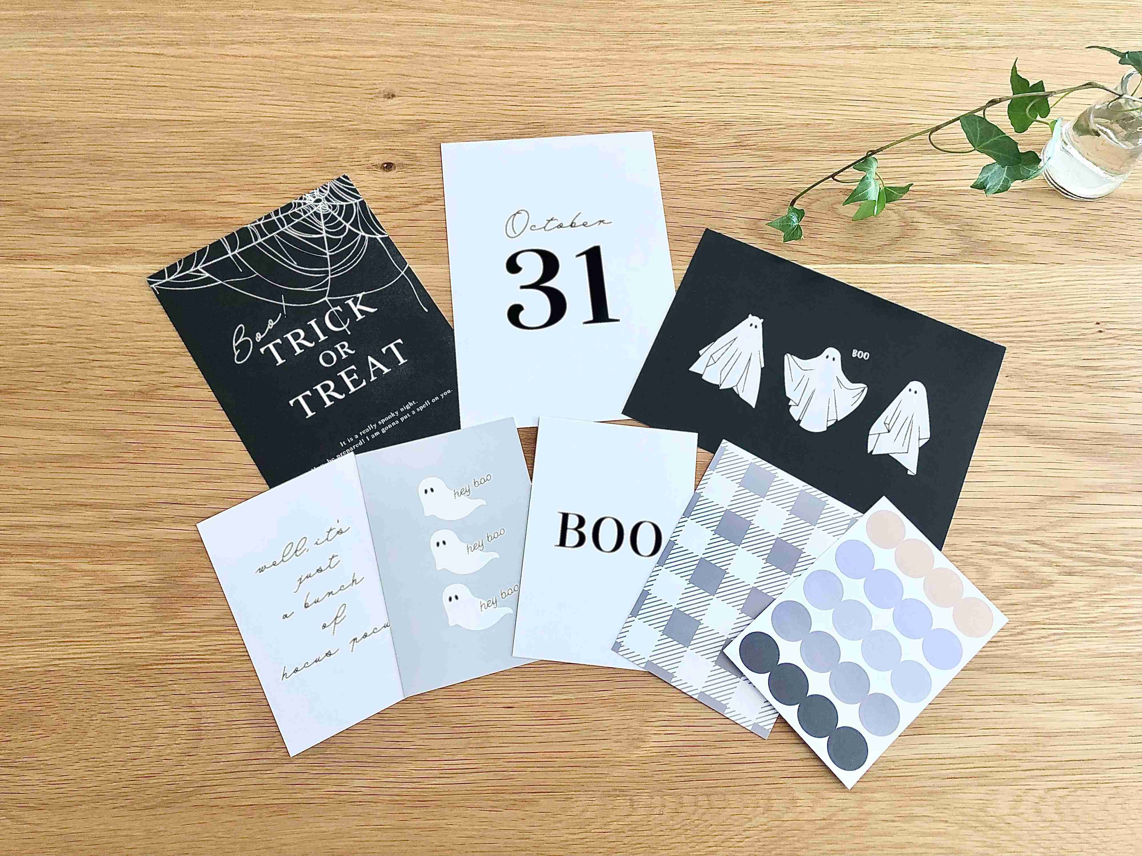ロゴやお化けのイラストが可愛い、インテリアカード。