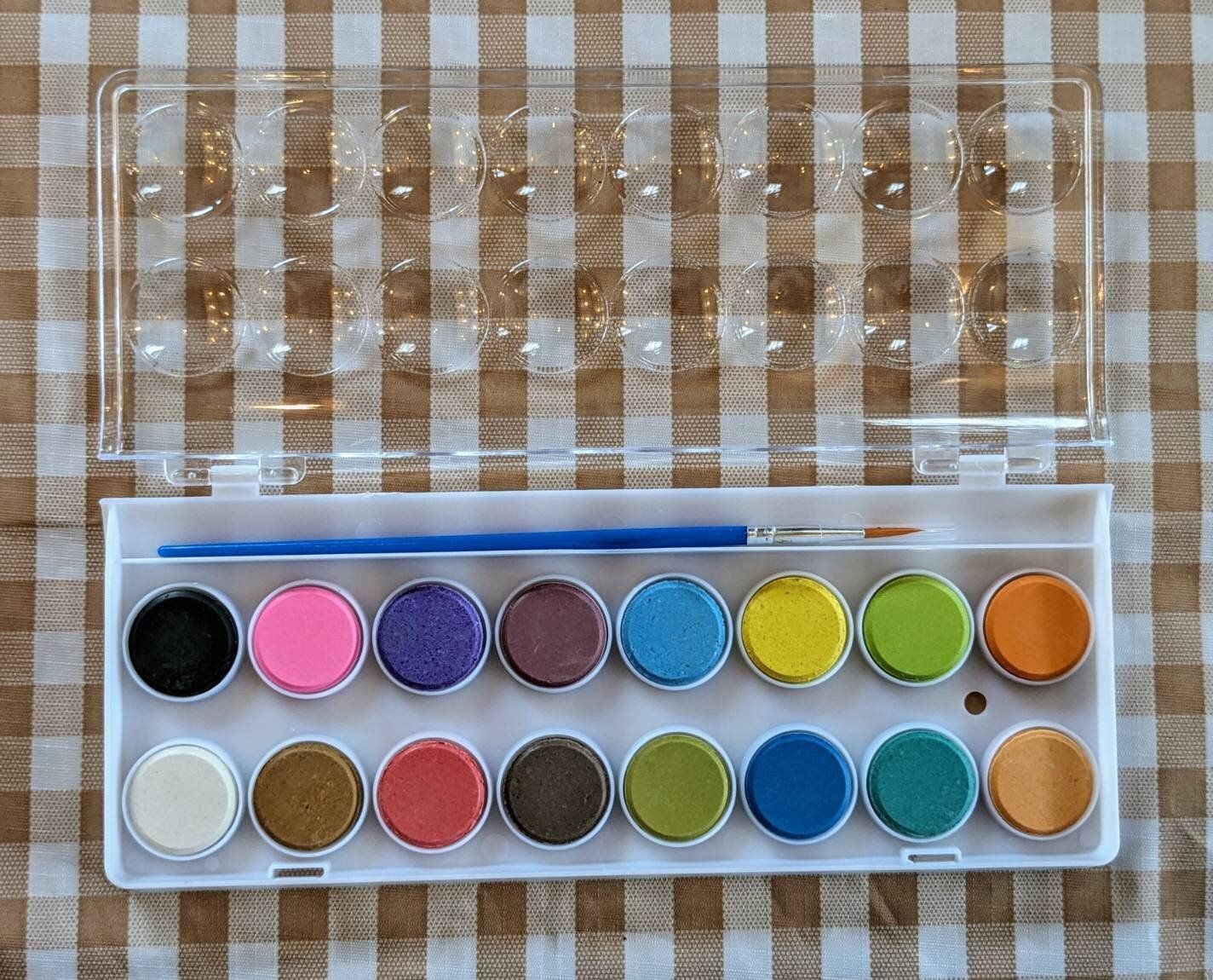 絵の具、パレット、筆が一体になっているこのアイテム! 収納に場所を取らないのは、職業柄オススメできるポイントひとつです。また、大きなバケツの代わりに紙コップを使用すれば、気軽に使い捨てることもできます。