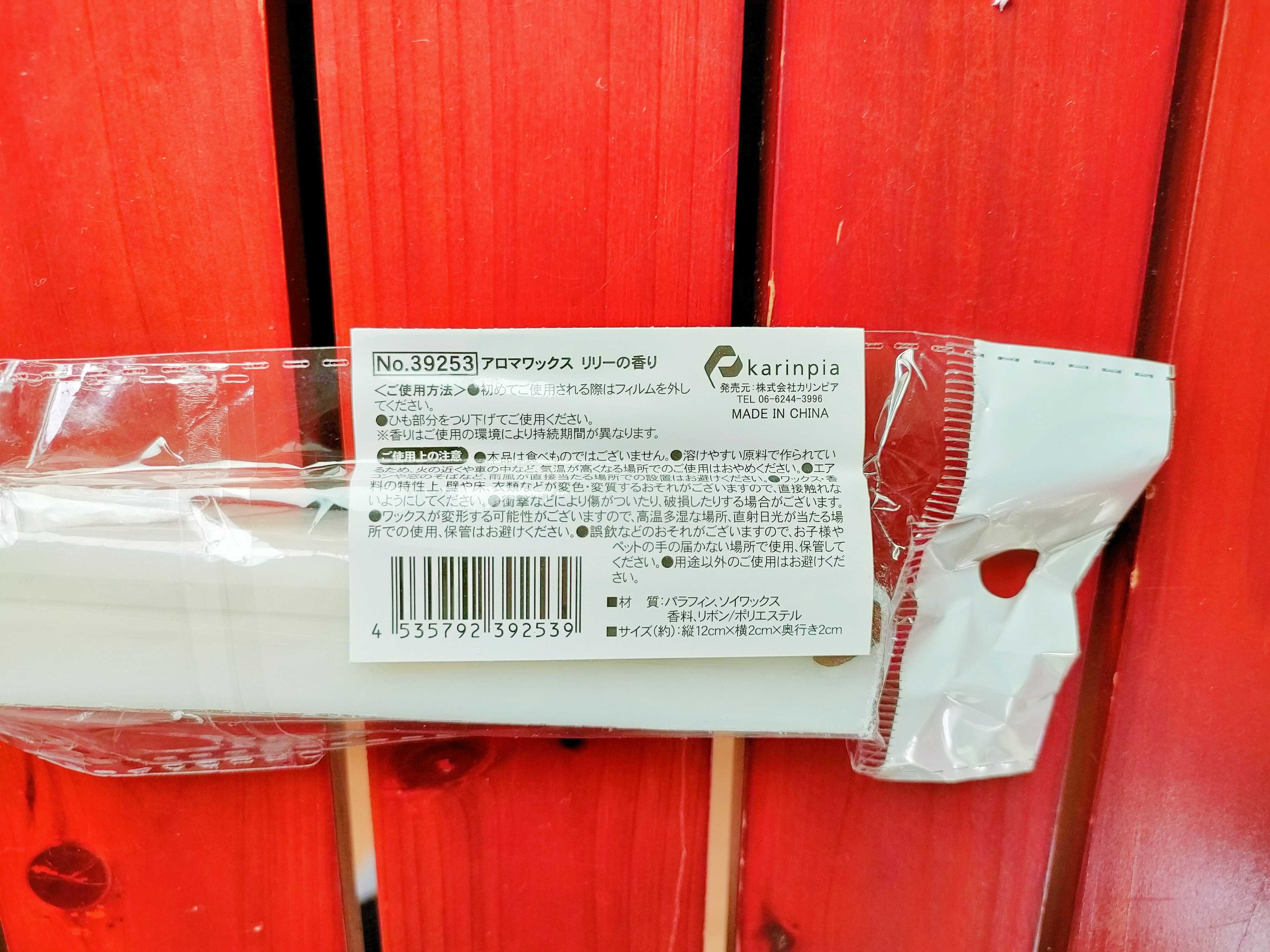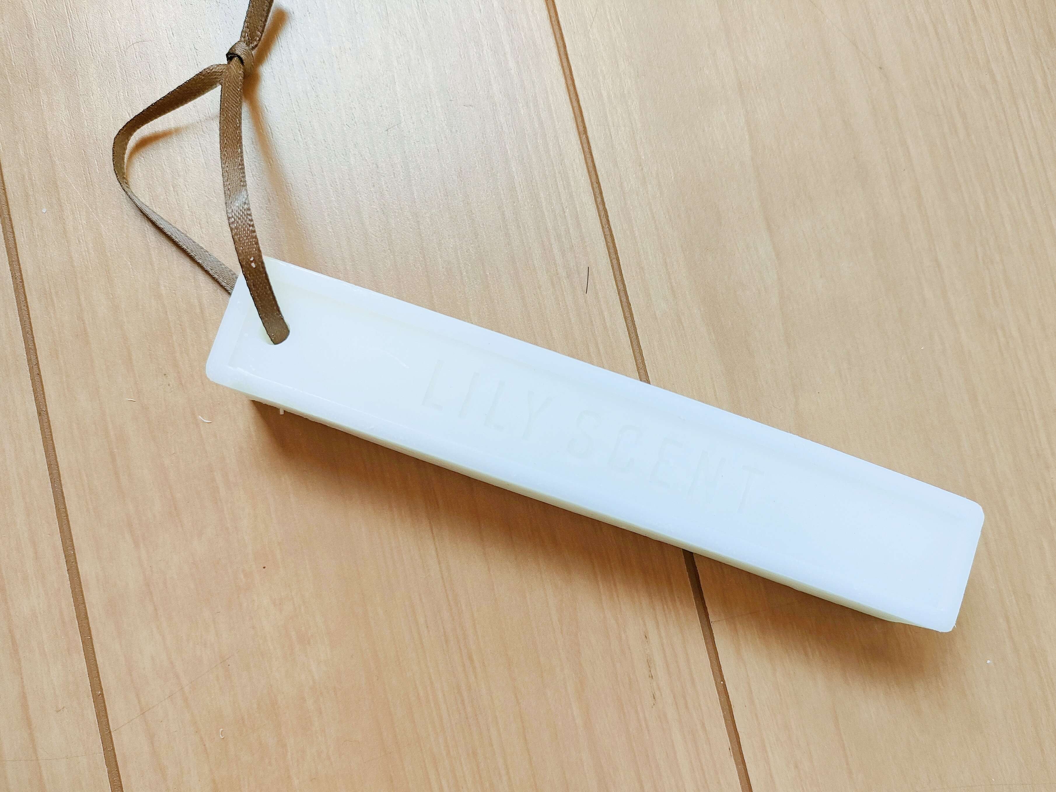 今回購入したものは「アロマワックス リリーの香り」。ホワイトのワックスバーに、茶色の紐がついています。「LILY SCENT」(訳リリーの香り)の文字がおしゃれ!