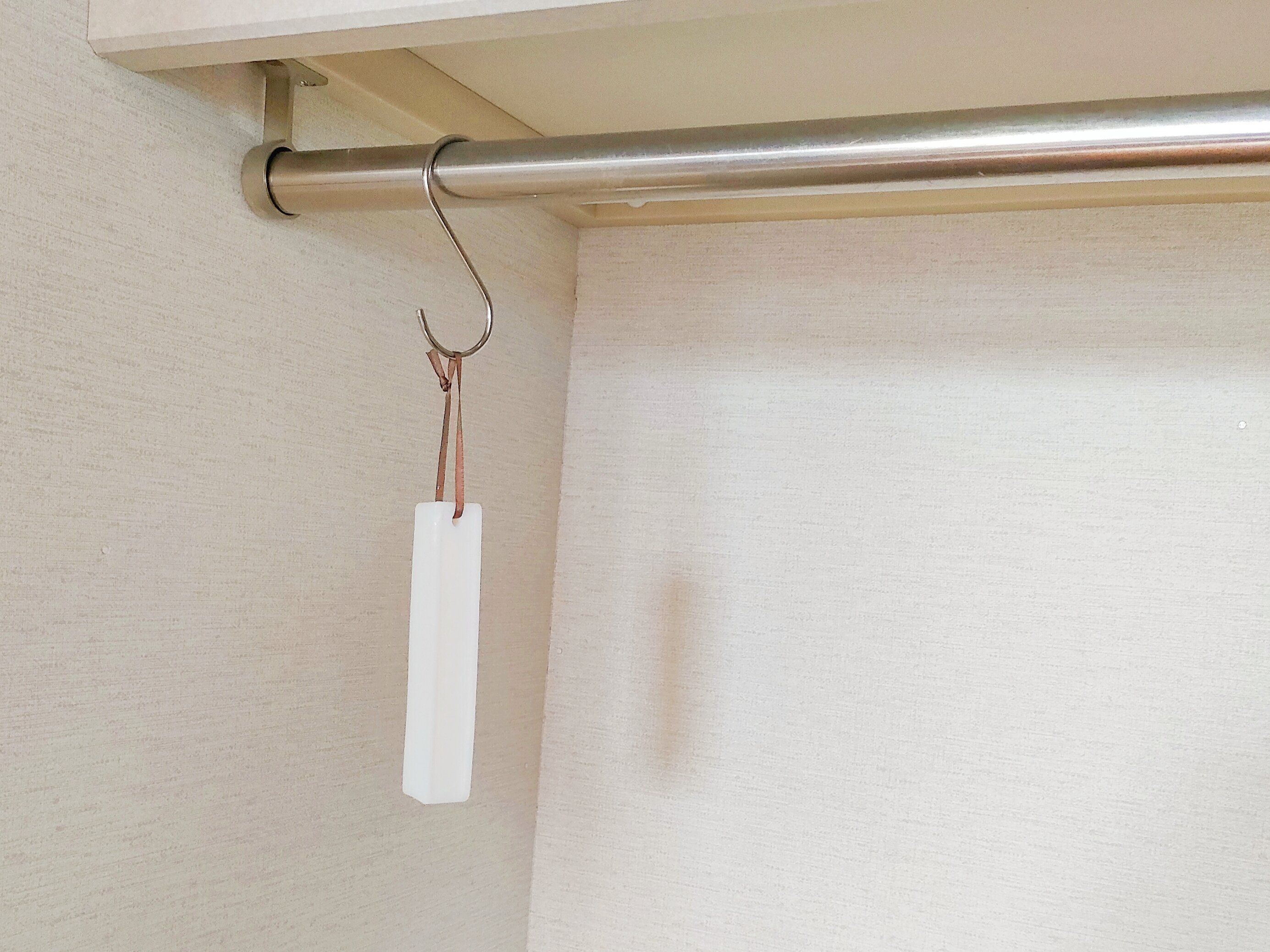 クローゼットの中に吊り下げてみました。スティック型だから細身で場所を取らないし、紐があるからかけやすい!