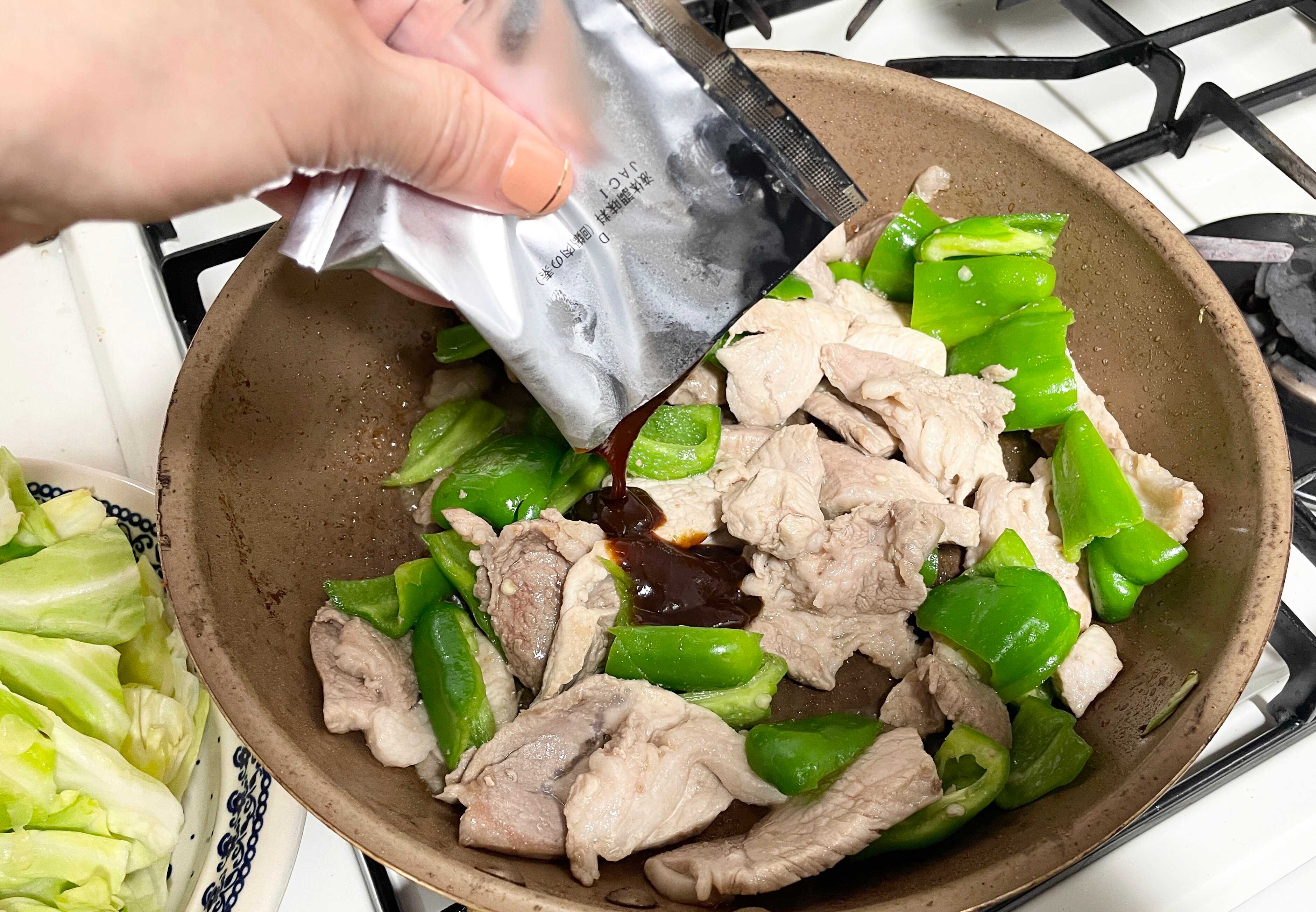 キャベツがしんなりしたら、一旦取り出してから、他の材料を炒め、火が通ったところで「大阪王将 回鍋肉の素」を入れます。