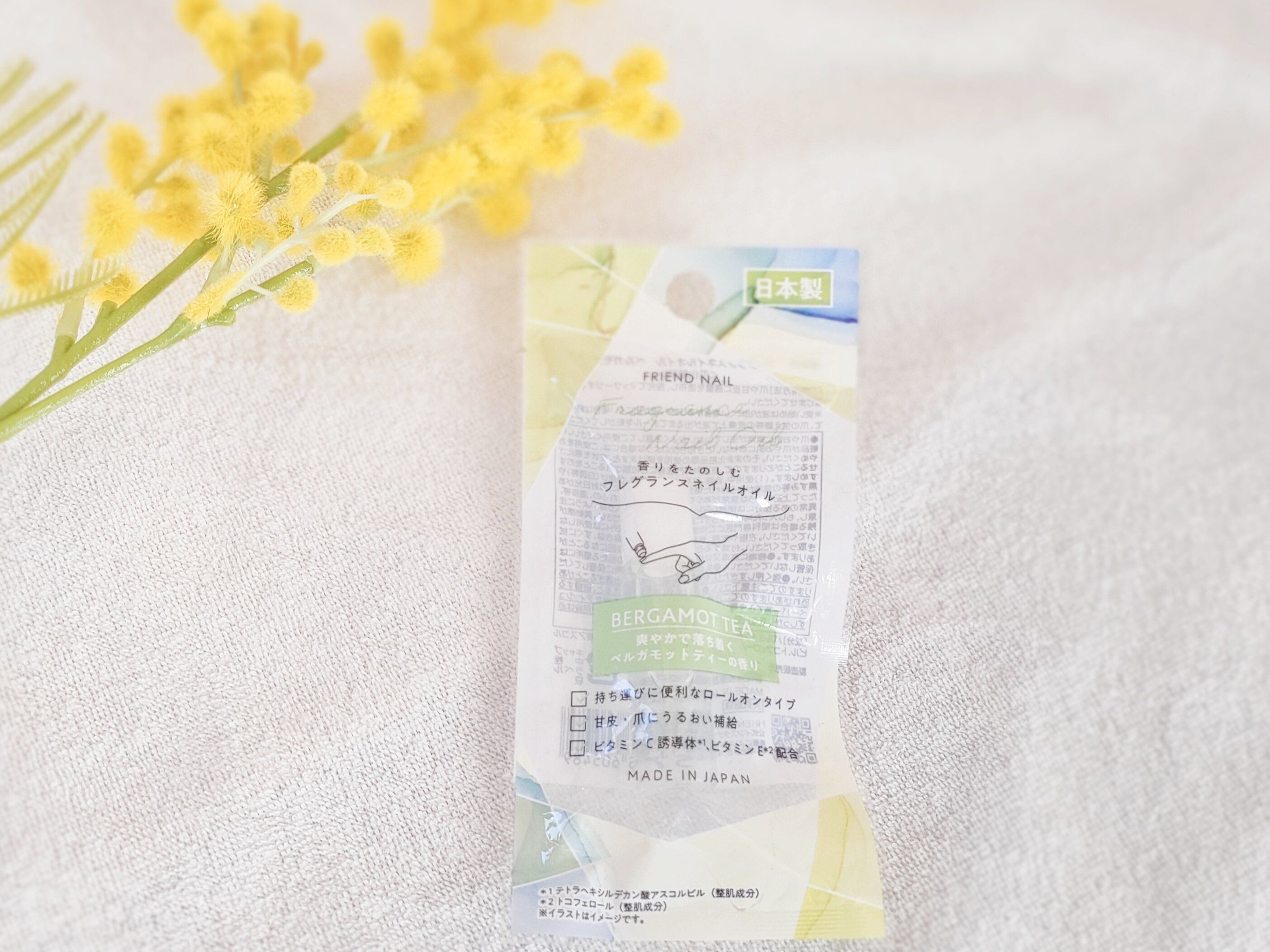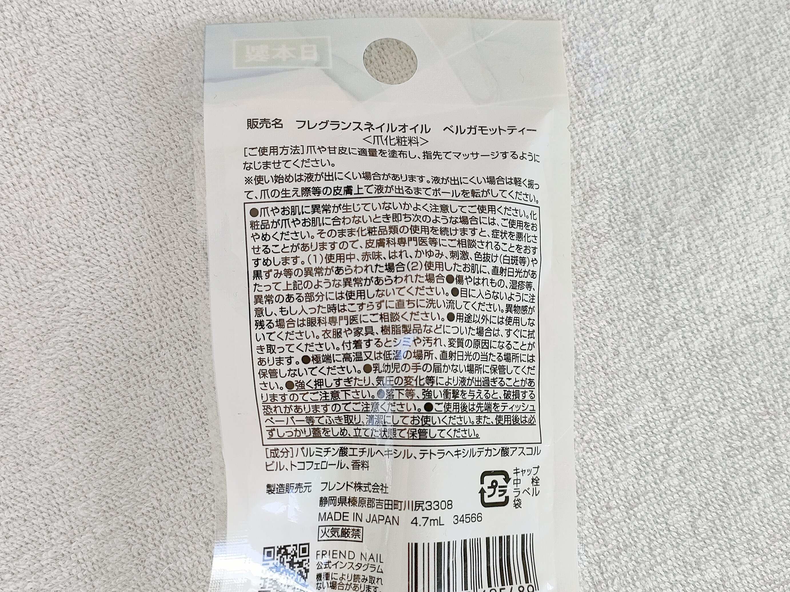 こちらがおすすめしたい「フレグランスネイルオイル」110円(税込)です。全部で6種類の香りがあり、ベルガモットティー、ホワイトムスク、コットンローズ、フローラルシプレー、リネン、シトラスガーデンです。