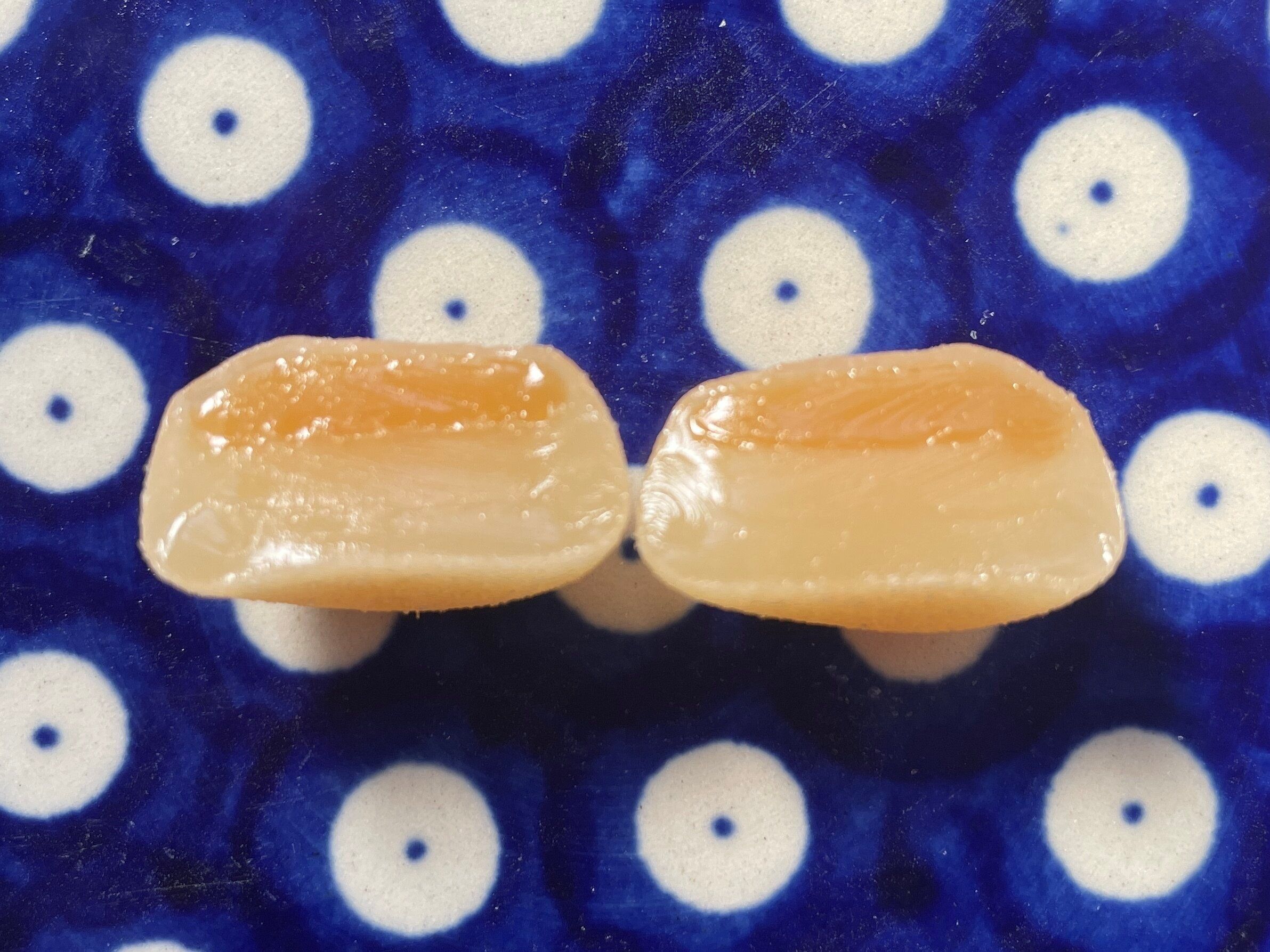 中は二層になっていて、色の濃いところがカスタード風味。周りより少し柔らかい食感です。