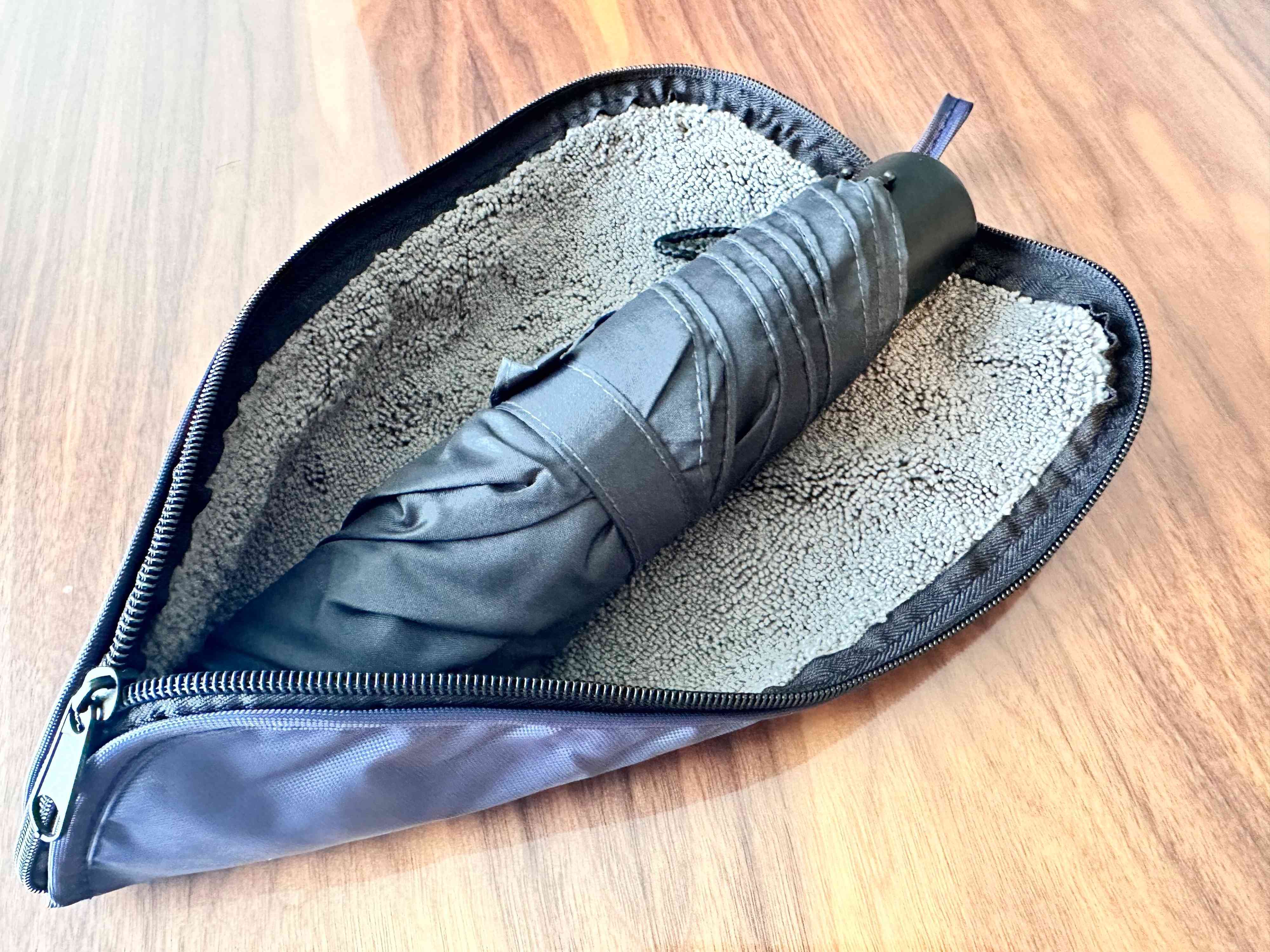 収納袋の内側がマイクロファイバー生地になっているので、水滴をしっかりと吸水してくれるようになっていますよ。