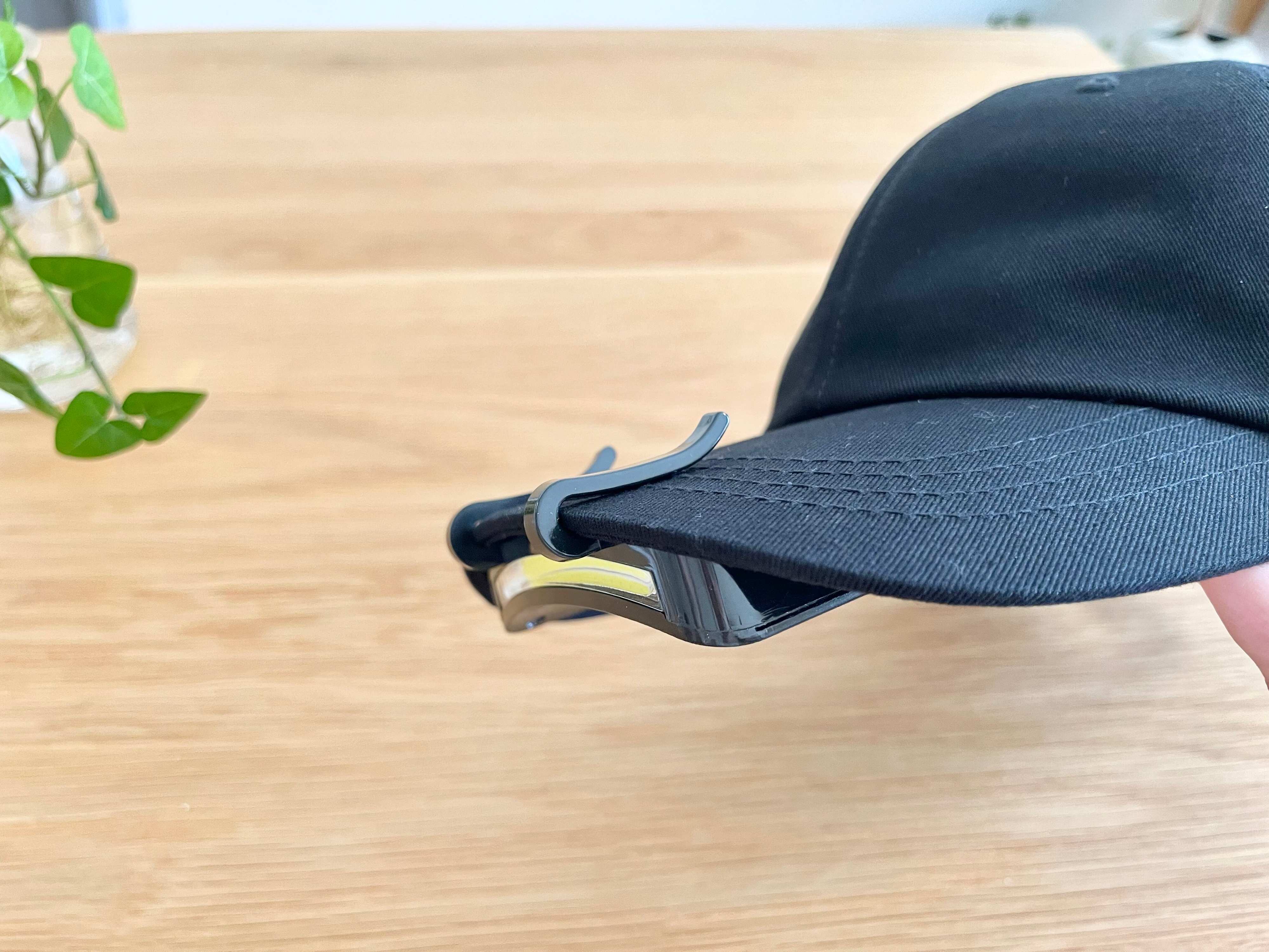 本体に付いているクリップ部分を、キャップのツバにしっかり差し込むだけで完成なんですよ。ごく一般的なヘッドライトだとベルトの長さを調節する必要がありますが、コレなら差し込むだけなのでとっても簡単!家族間でも手軽に交換して使うこともできますよ。