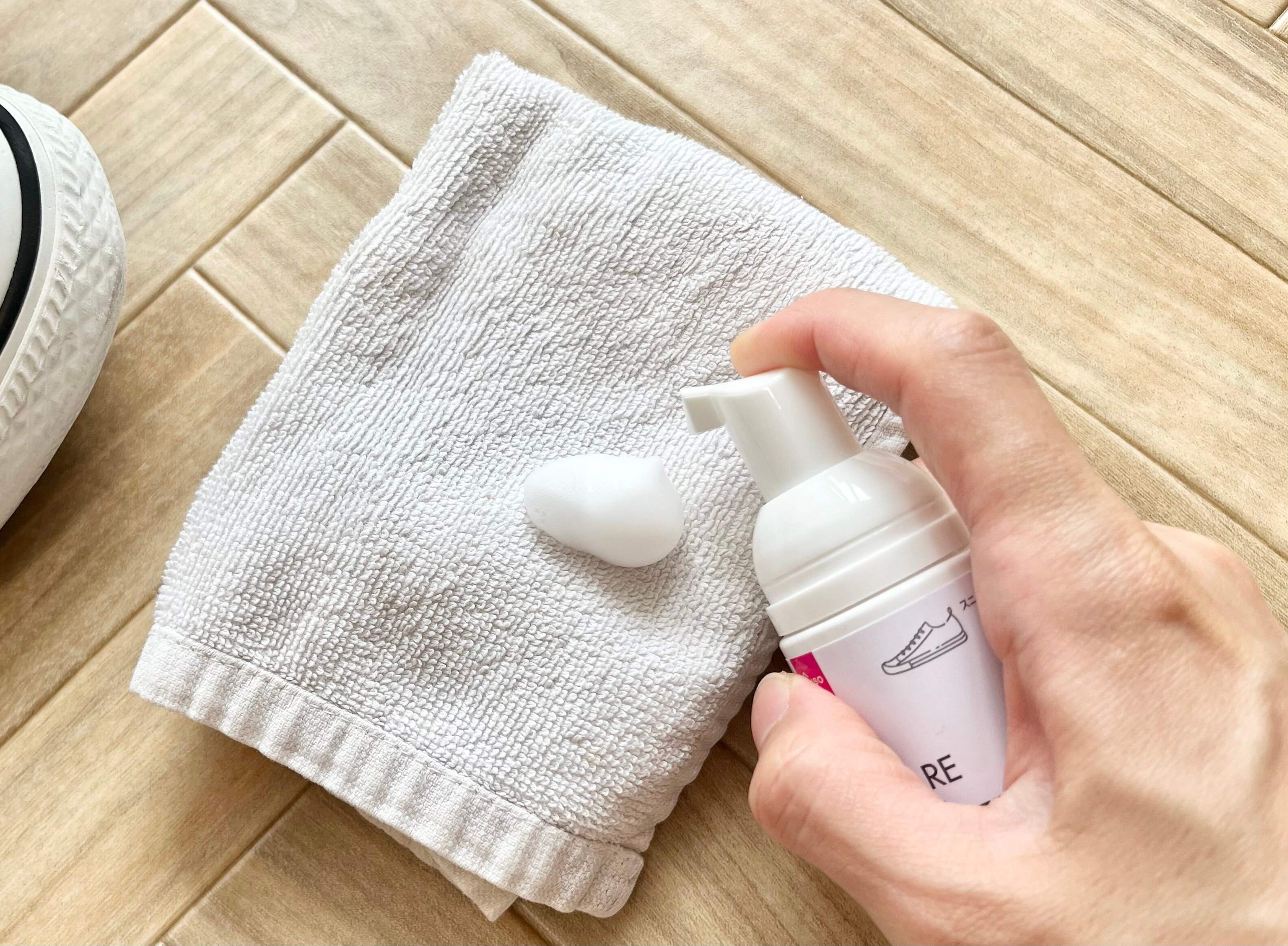 泡クリーナーをクロスに出して、汚れが気になる部分をクロスで拭いていきます。量は片足で3~5プッシュ程度の少量でいいそうです。