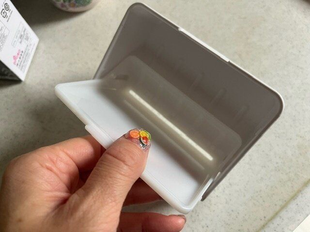 石けんをいれるとこんな感じです。ぴったり収まりました。もうひと周り大きい石けんでも大丈夫そうです。
