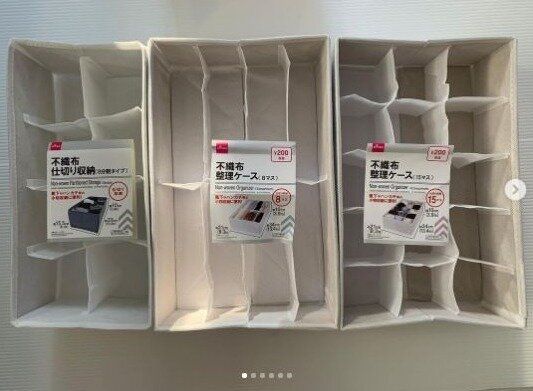 ダイソーの不織布仕切り収納は下着や靴下、小さな洋服などを収納するのにピッタリ。引き出しの中がぐちゃぐちゃにならず、きれいに収納することができます。