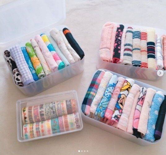 いくつあっても便利なハンドタオルやハンカチ類は、重ねられる収納ボックスに収納。半透明なので中身もわかりやすく、ふたもついているので衛生的ですね。