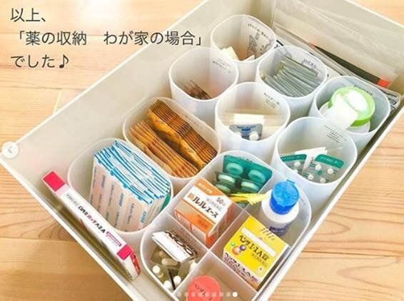 引き出しの中で、箱から出して薬を収納するアイデアです。さまざまな大きさの積み重ねボックスを組み合わせることで、引き出しの中でシンデレラフィット。探しやすく、とっても取り出しやすいですよね!もちろん、説明書もいっしょに入れてあるので安心です。これは真似したくなる薬の収納アイデアですね。