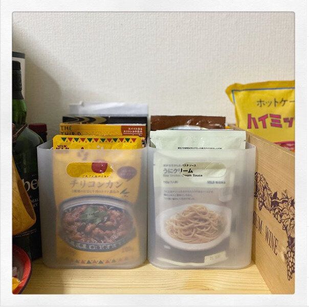 ストック食材として定番のレトルト食品は毎日の食事だけでなく非常食としてローリングストックしておくのにも便利です。気がついたら期限が切れていたなんてことのないようにするためにも、レトルトサイズにぴったりで出し入れしやすい積み重ねボックスに入れておくことがオススメです。