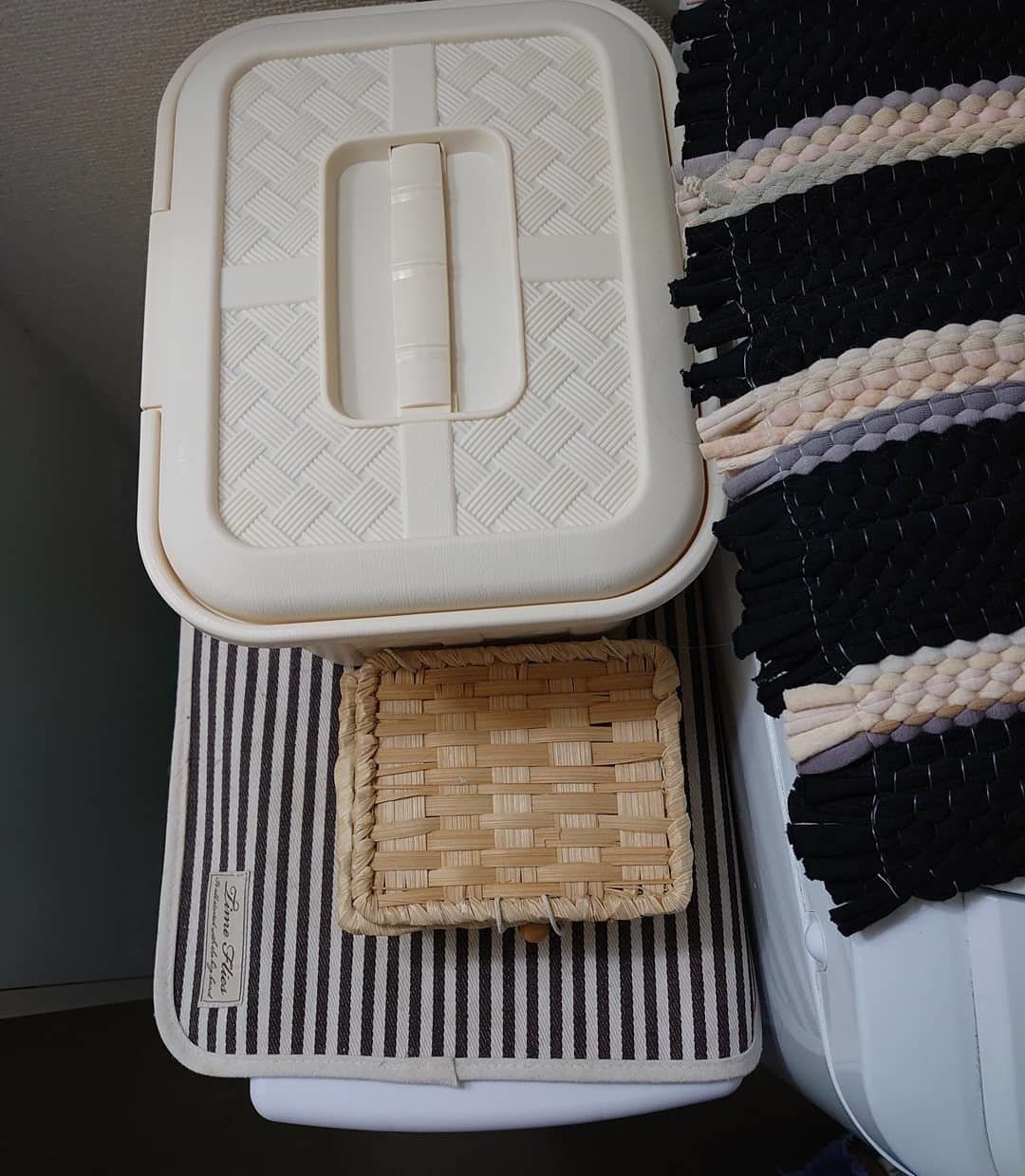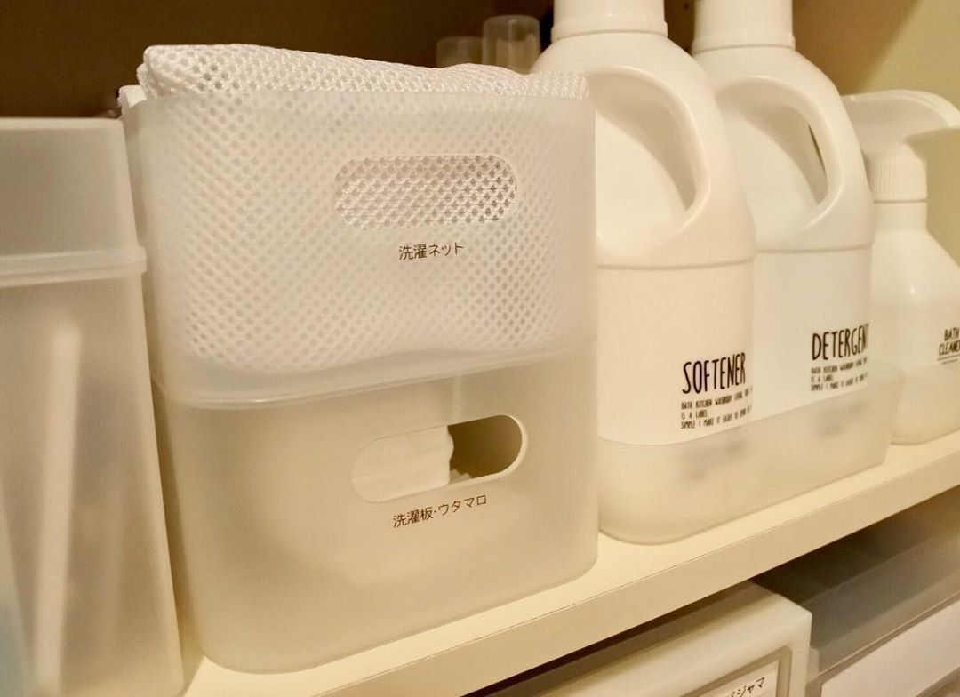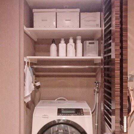 洗濯機の洗剤の横にあるのはダイソーの積み重ね収納ボックス。この中には洗濯ネットが入っています。白で統一するとすっきり見えますね。