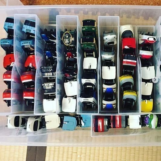 ダイソーのふたつき収納ボックスにカラフルなおもちゃを収納している例です。カラフルなものを透けないボックスに収納すれば、ごちゃごちゃ感や生活感が出ずにすっきりしますね。ふたがついていると重ねることもできるので、たくさん収納できます。