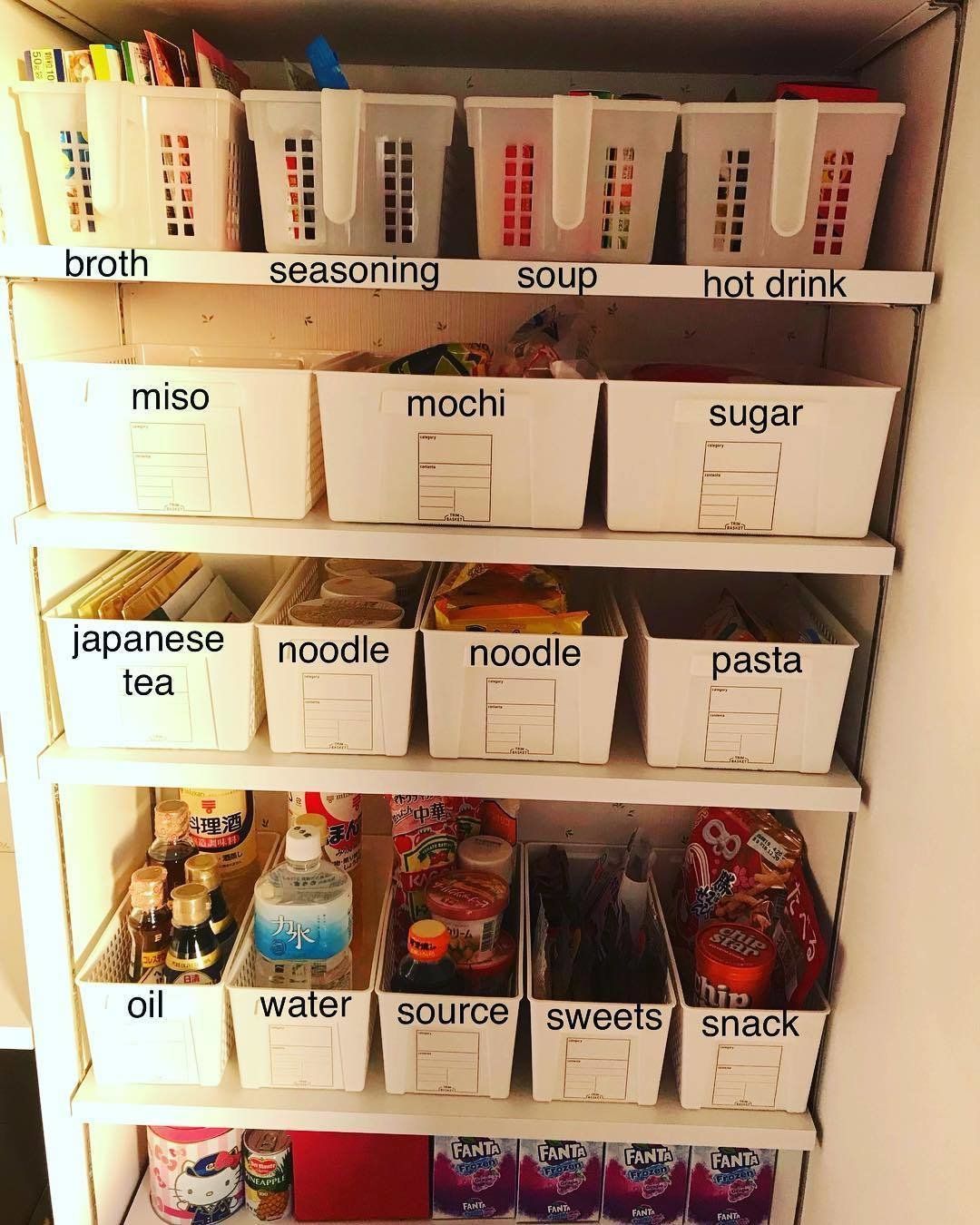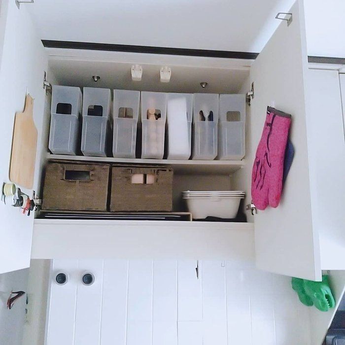 毎日使うような食材やアイテムはパッケージから取り出して詰め替え収納することで残りが一目でわかるのでオススメです。積み重ねボックスの小サイズはふりかけなどの小さなアイテムもすっきりきれいに収納できるので便利です。