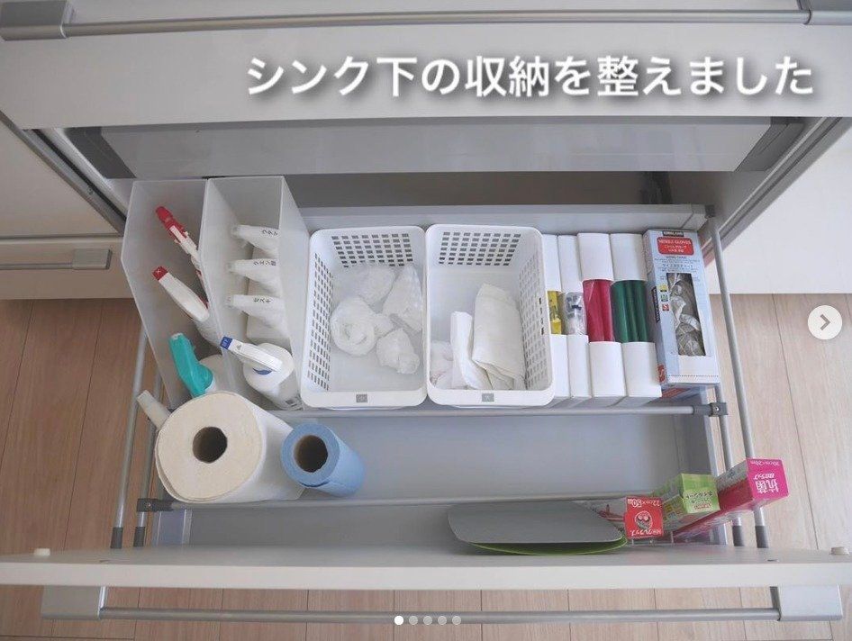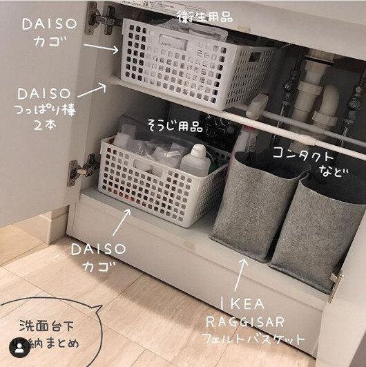 こちらは洗面下のスペースに突っ張り棒で棚をつくったアイデア。高さや奥行きなどサイズが豊富なダイソーのかごの中から、ぴったりサイズのものを選べば、デッドスペースも有効活用できますね。