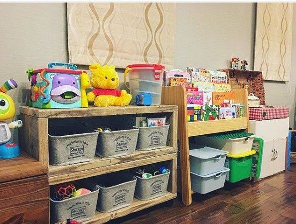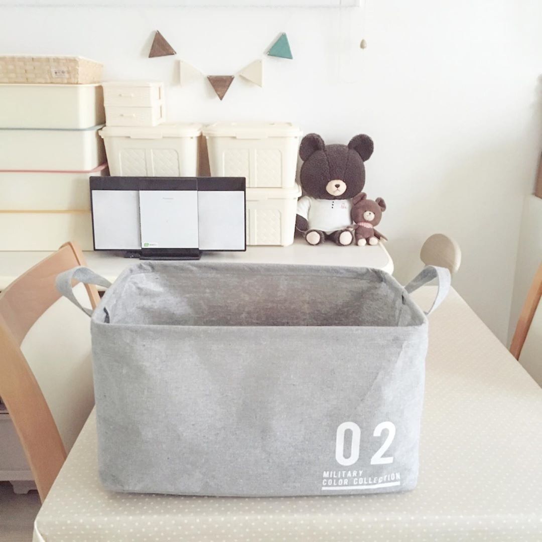 ごちゃごちゃしがちなおもちゃ収納も、布製ストレージボックスを使えば、こんなにすっきり!遊ぶときは、ボックスごと取り出して持ち運びも自由。ストレージボックスなら、小さな子どもでもポンポンと投げ入れて収納することができ、お片づけレッスンにももってこいですね。