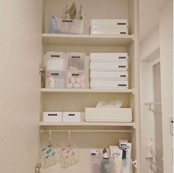 洗面台鏡裏の収納スペースは、積み重ねボックスを使えばスッキリきれいに整理整頓することが可能です。ボックスごとにラベルを貼ってものの住所を決めて置けばより散らかりにくくいつまでもきれいを保てるのでオススメです。