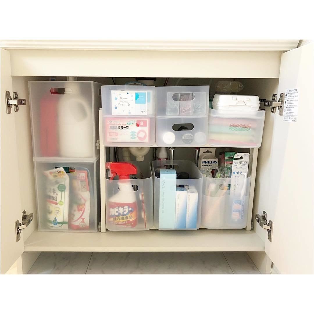 こちらは洗面台の収納棚。積み重ねボックスを使って、使い捨てコンタクトやコットンを収納してあります。ふたつきなのでホコリの心配もなく、見た目にもすっきり。ほどよく透けて見えるのも、積み重ねボックスのいいところですよね。