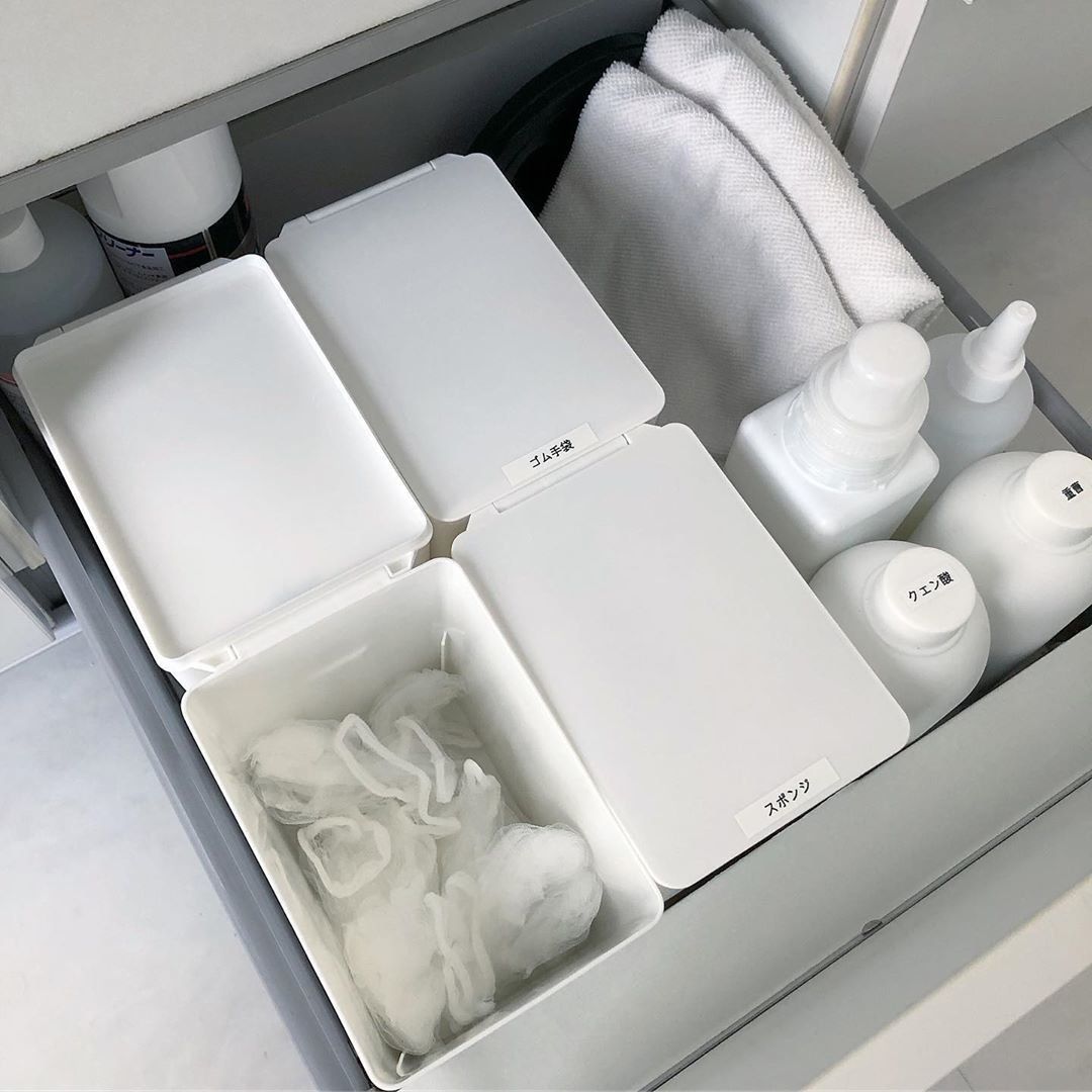 いろいろなサイズのある積み重ねボックスは収納の中の小分け収納にぴったりです。収納ボックスの中のこまかいものや倒れやすいものをまとめるのに使え、デザインもとてもシンプル。