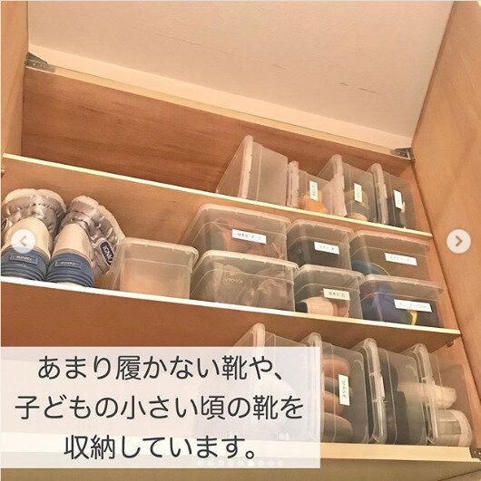 靴箱内をキレイに整頓できるシューズ収納ボックス。透明なのでパッと見て何が入っているのか分かりやすいです。ボックス内に収納することで靴箱内に土が上がらないのもうれしいですね。