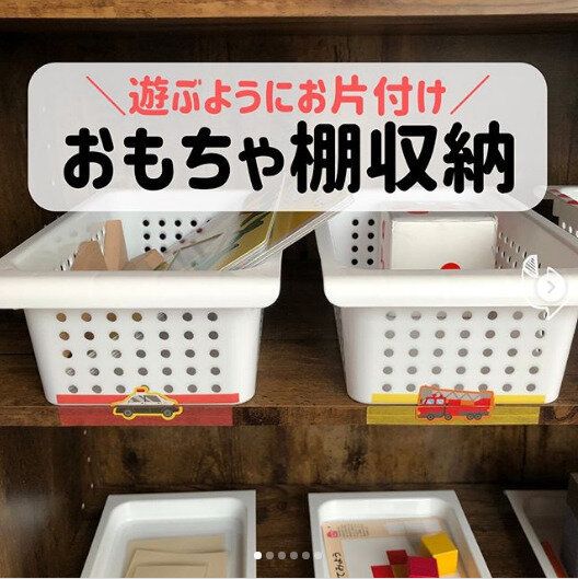 パズルのように楽しくお片づけができるよう、カゴと棚に半分ずつシールを貼りつけたアイデア。これなら、子どもも片づけ習慣が身につきそうですね。