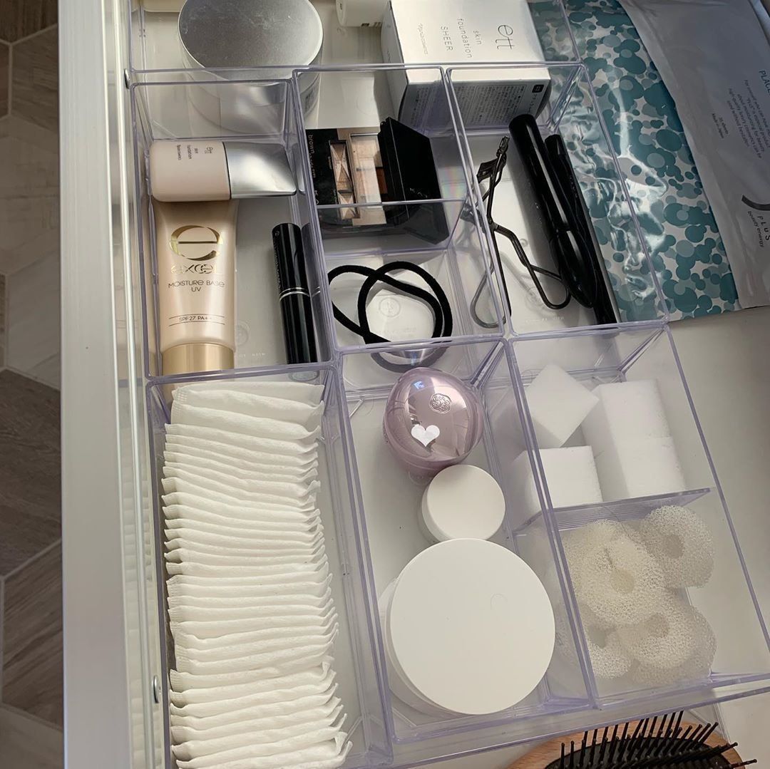 仕切りだけでなく中央に取っ手がついた整理トレーは、小物収納の強い味方!化粧品はもちろん、薬類やお菓子・文房具の整理整頓など幅広く活用できます。