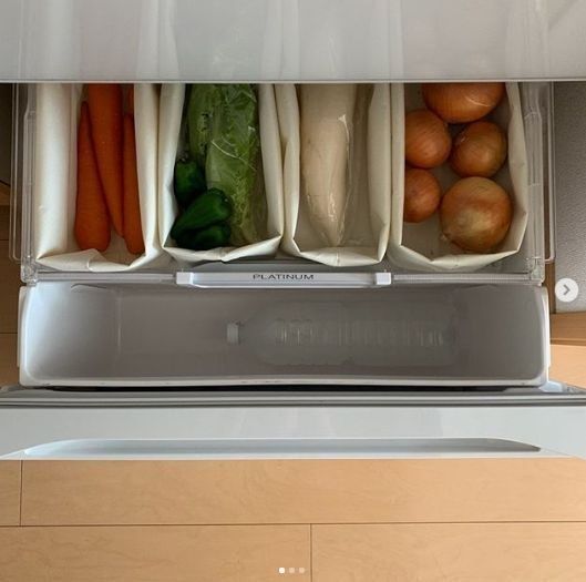 冷蔵庫の野菜室は汚れやすくて掃除もたいへん。ダイソーのトートバッグを使えば、このように野菜を種類ごとにまとめて収納することも可能。冷蔵庫の中もスッキリきれいにまとまって、掃除もしやすくなりますよね。