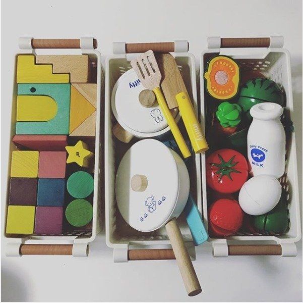 木の持ち手つきの小さめ収納カゴは、子どものおもちゃ入れにぴったり。コンパクトなので小さな子どもでも持ちやすく、お片づけのお手伝いもいっしょにできちゃいます。